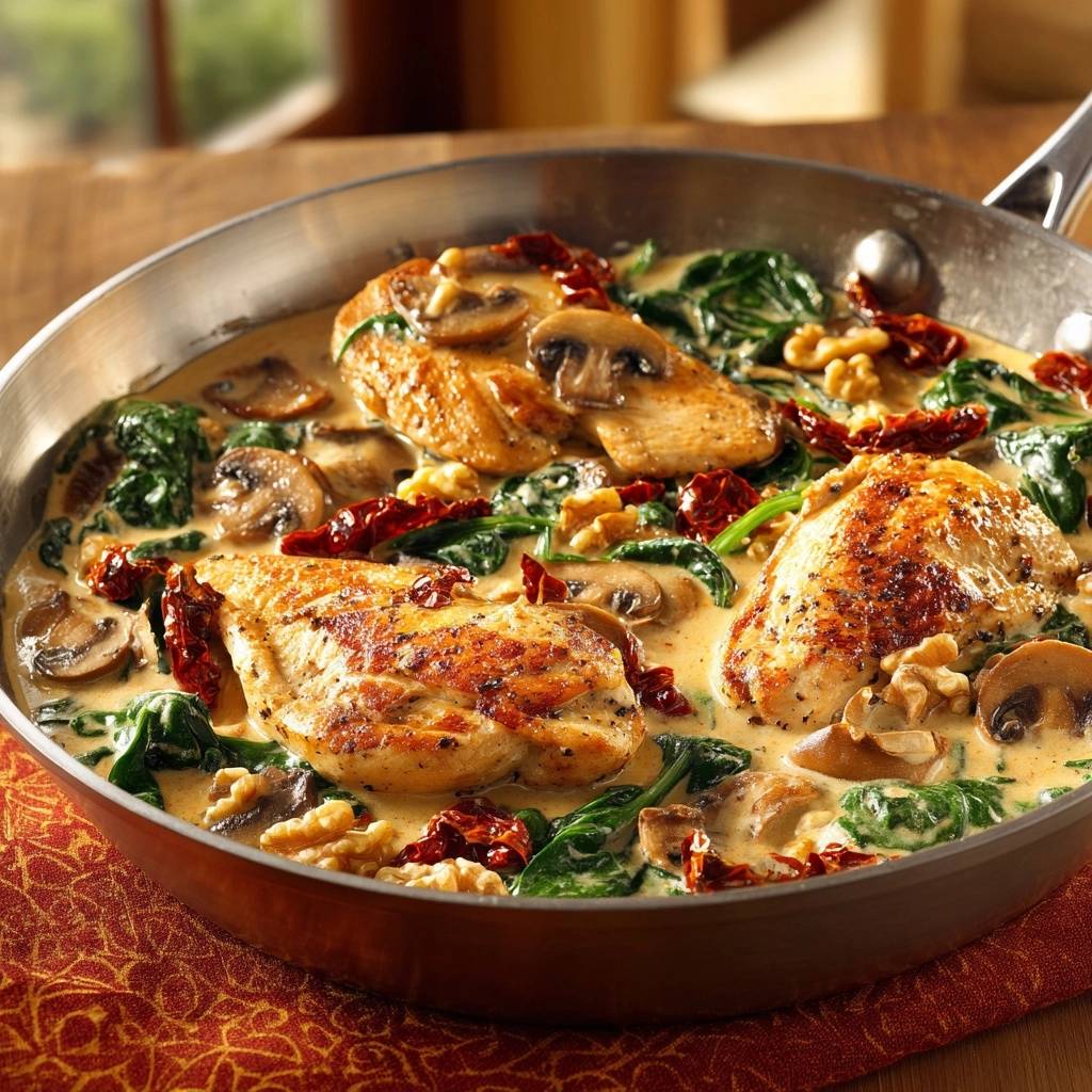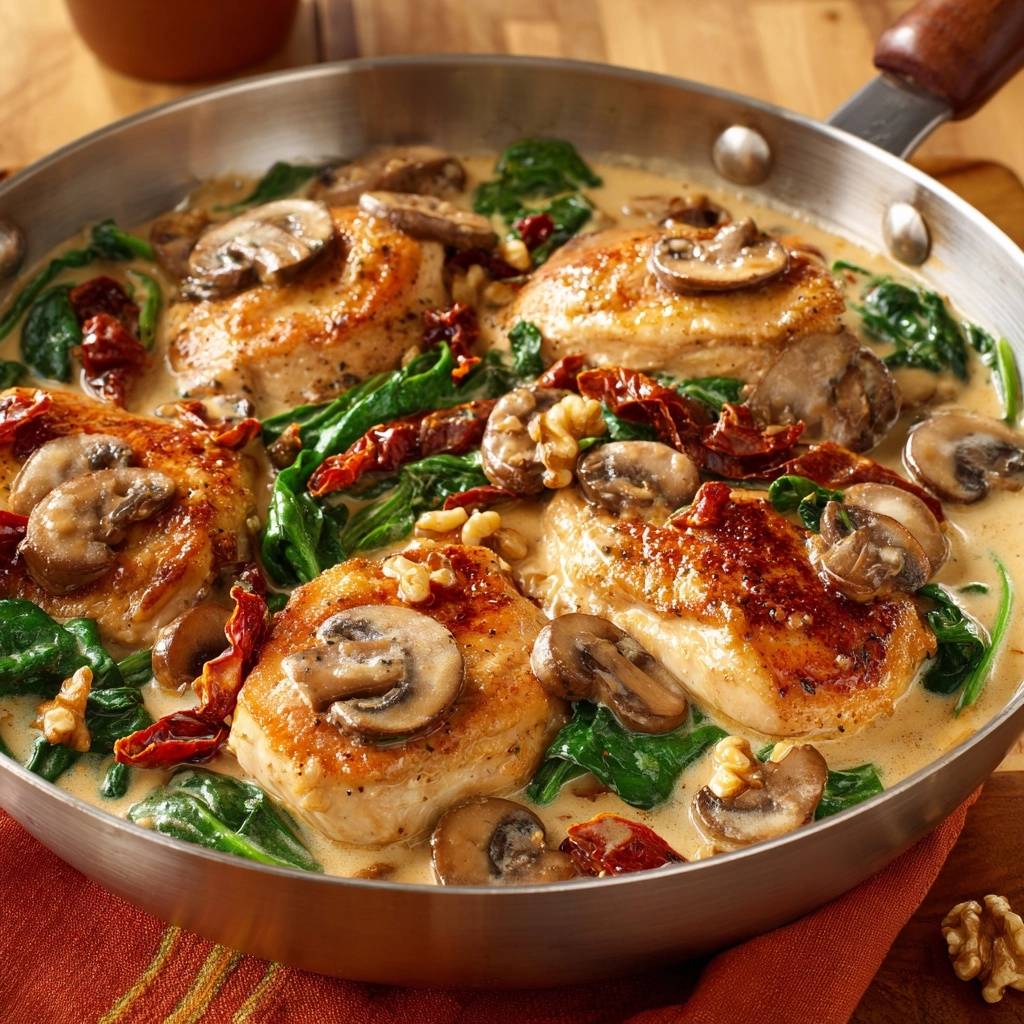 Tired of dry, bland chicken breasts that turn every skillet dinner into a disappointment? This Creamy Spinach Mushroom Chicken Skillet fixes that fast. You get juicy, golden-seared chicken in one pan, wrapped in a creamy sauce loaded with earthy mushrooms, wilted spinach, tangy sun-dried tomatoes, and crunchy walnuts. It’s restaurant-quality flavor without the wait.