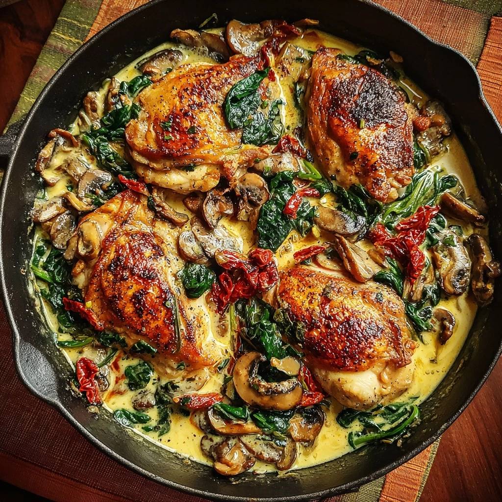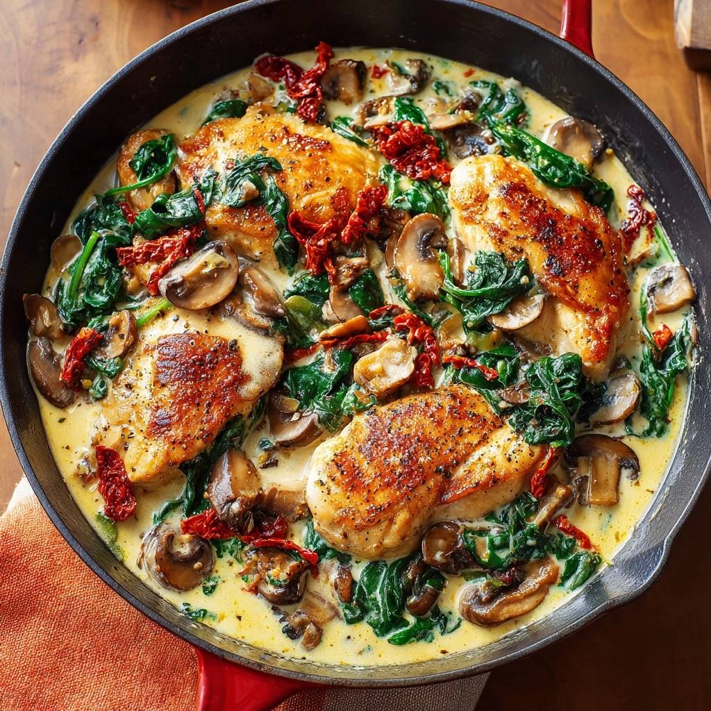 Ever bite into chicken that’s tough and dry in a creamy skillet? This Creamy Tuscan Chicken Skillet fixes that fast. You get juicy, golden chicken breasts seared screaming hot, then nestled in a rich sauce with tender mushrooms, tangy sun-dried tomatoes, and vibrant spinach. All in one pan, ready in 30 minutes.