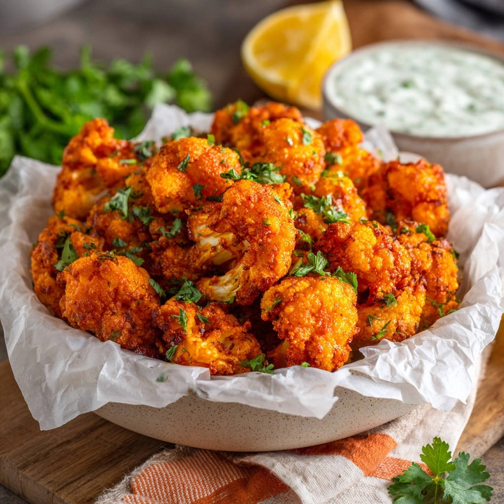 Garnish the sauced Crispy Buffalo Cauliflower Bites with extra fresh chopped parsley or cilantro. Serve them immediately with the homemade herb dip on the side for a perfect balance of heat and cool creaminess.