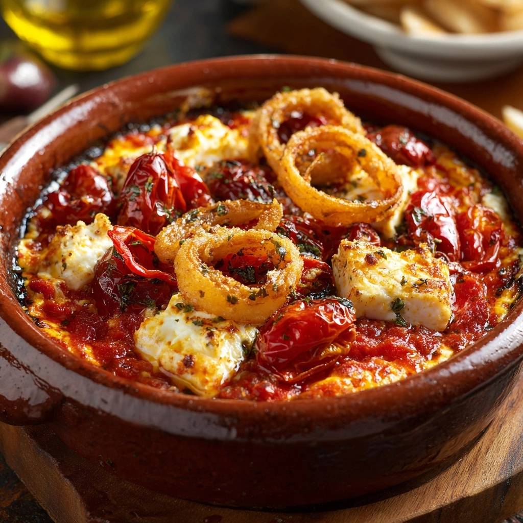 - Transfer pepper-tomato mix to oven-safe dish (like terracotta cazuela). Nestle in fried calamari rings. Top generously with crumbled feta.