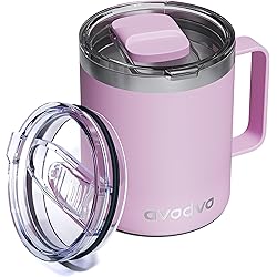 avodvo 12oz Insulated Coffee Mug with Lid – Includes Two Lids, Stainless Steel Coffee Travel Mug with Handle, Double Wall Vacuum Insulated Camping Mug for Home, Office & Outdoor, Pink