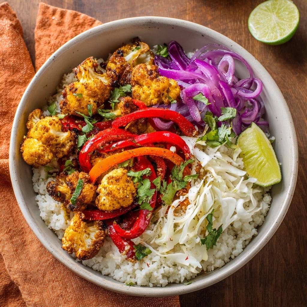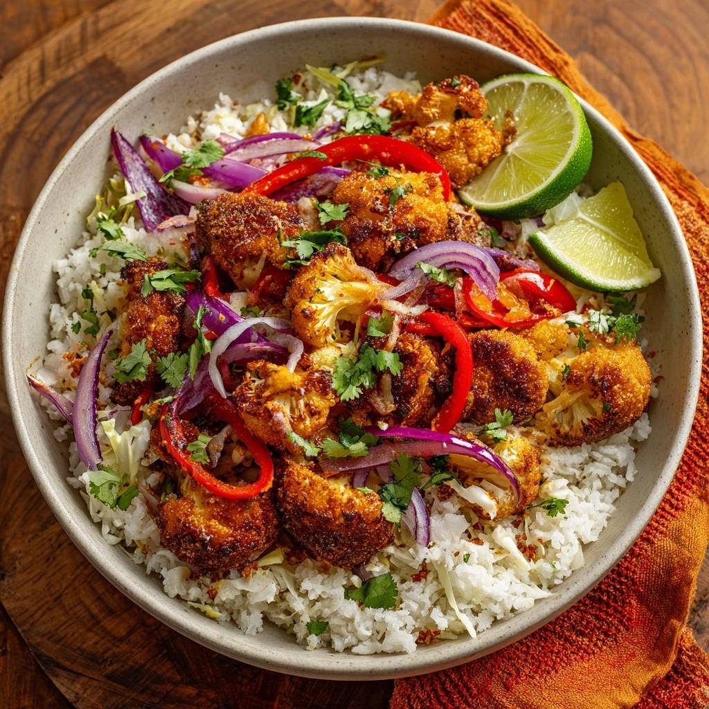 - Assemble bowls: Divide warm rice among 4 bowls. Top with shredded cabbage, sliced red bell pepper, drained pickled onions, crispy cauliflower, cilantro, and lime wedges. Squeeze lime over top for zing. Serve immediately for peak crunch.