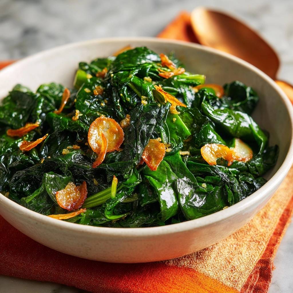 Then you hit the spinach with high heat for a quick wilt that soaks up every bit of that infused oil. You get glossy, tender leaves topped with golden garlic crisps. It’s the texture contrast that makes your sides pop, and it takes under 10 minutes.