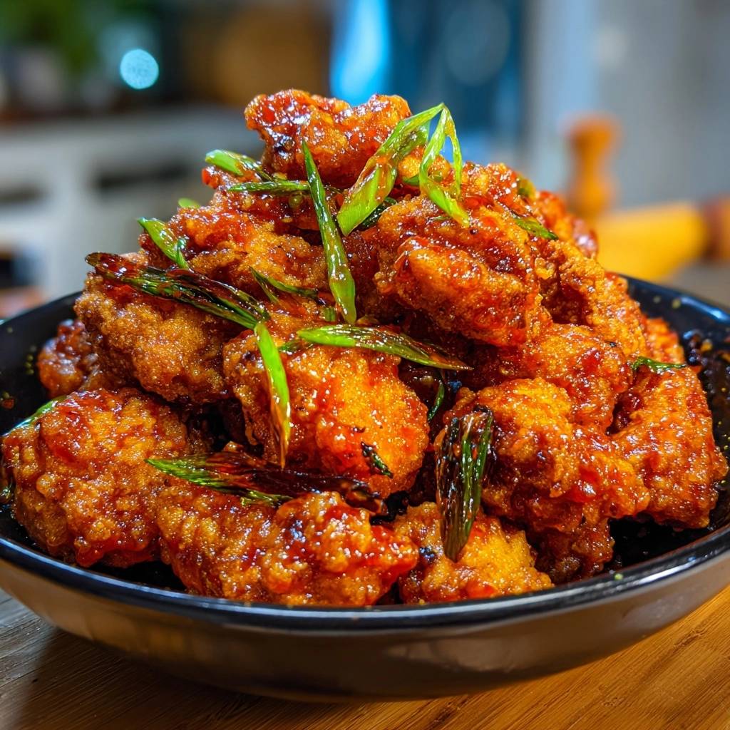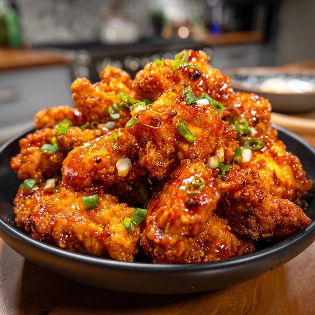 - Toss hot chicken in sauce in large bowl, coating lightly. Garnish with green onions and chilies. Serve immediately to lock in crunch. Enjoy crispy perfection!