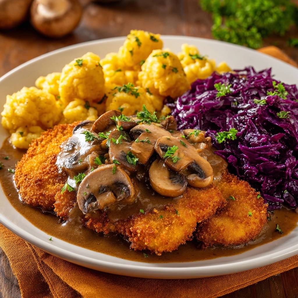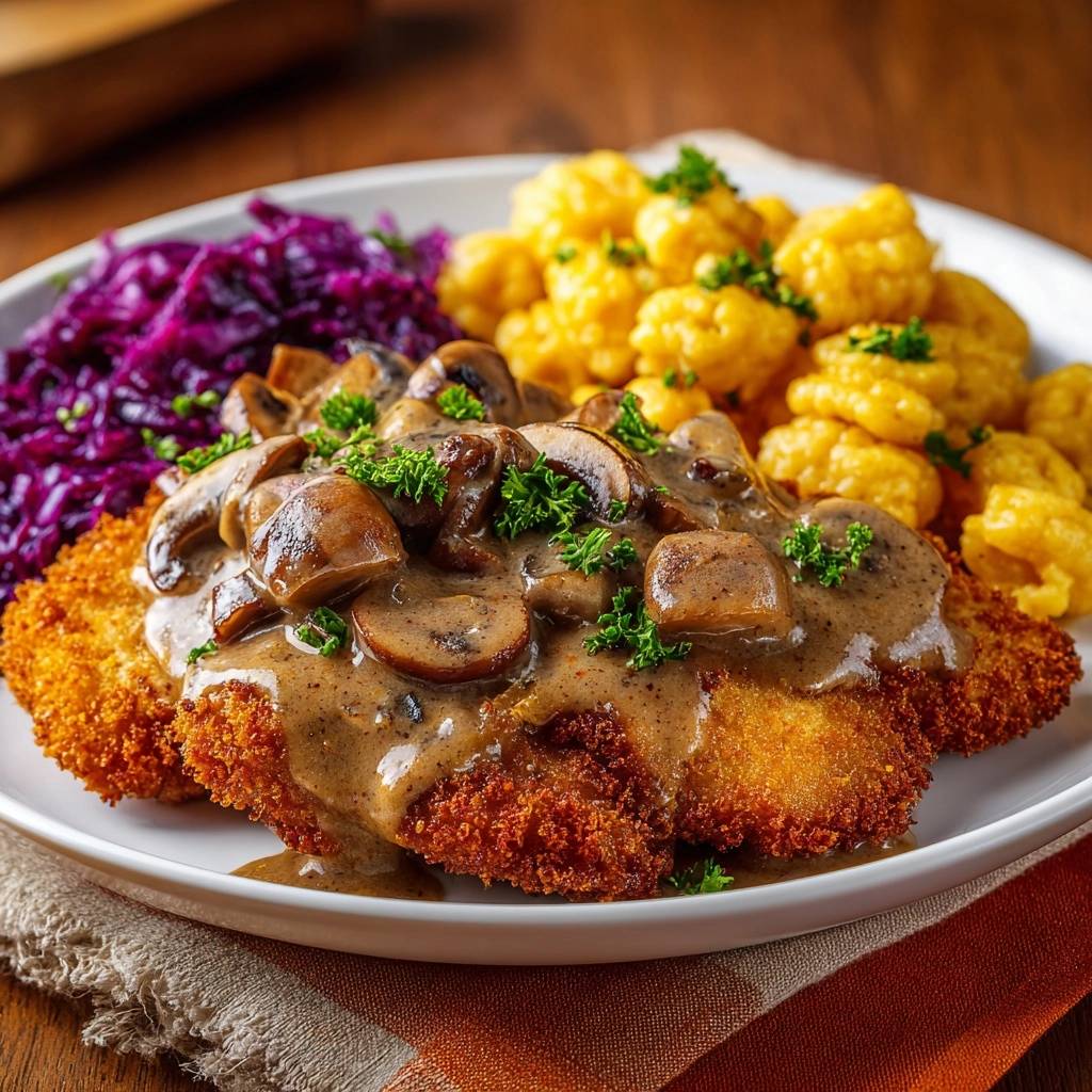 - Assembly: Place the crispy schnitzel on a plate. Ladle the creamy mushroom gravy over the center, leaving the edges exposed to showcase the crunch. Serve alongside a generous portion of braised red cabbage and potato dumplings. Garnish the entire plate with fresh parsley.