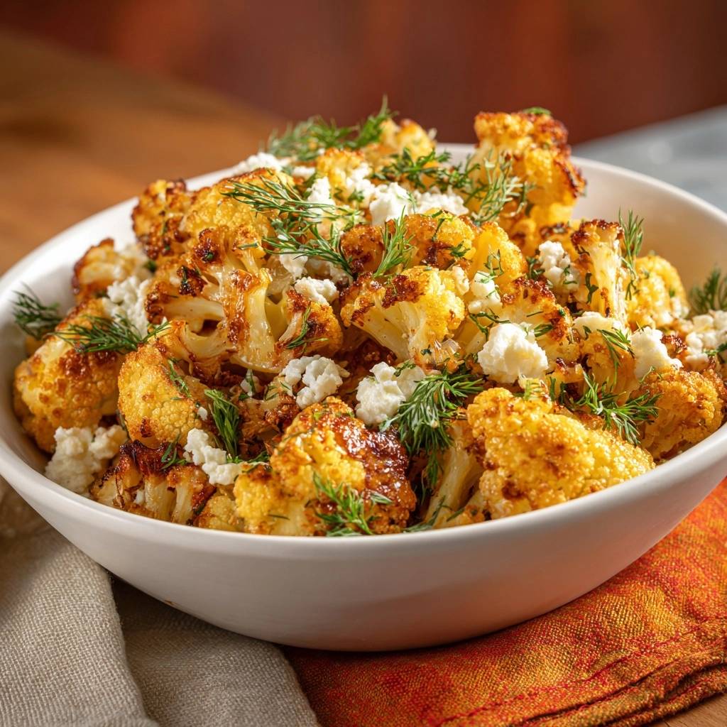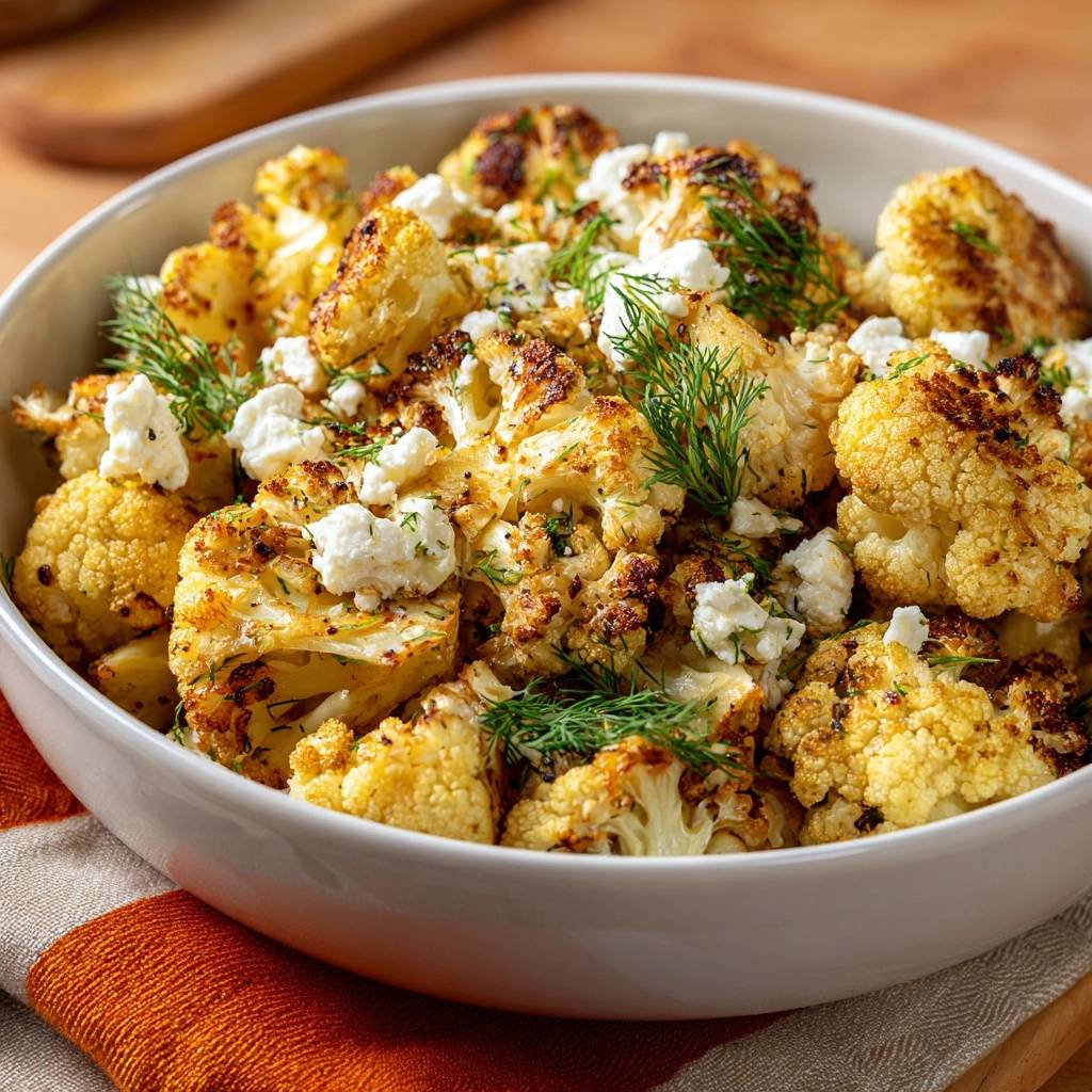 - Remove from oven, immediately toss with chopped fresh dill, and sprinkle with crumbled feta. Serve warm. The cheese melts slightly into the hot cauliflower for perfect texture contrast.