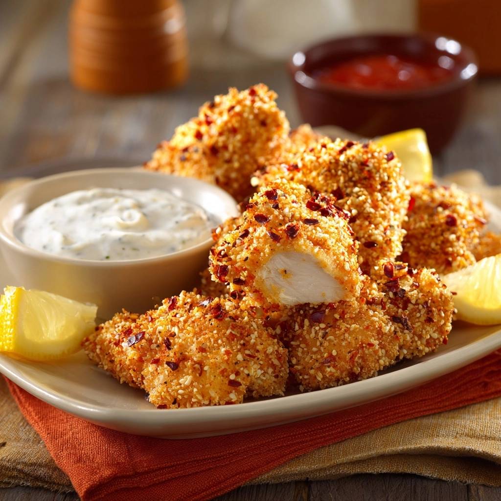 Panko’s airy flakes beat regular breadcrumbs for lightness. Sesame seeds toast up nutty and stick well. Vegetable oil for frying keeps it neutral. Serve with 1/2 cup ketchup, 1/2 cup plain yogurt or mayo dip, and lemon wedges. No buttermilk? Yogurt works fine in the dip.