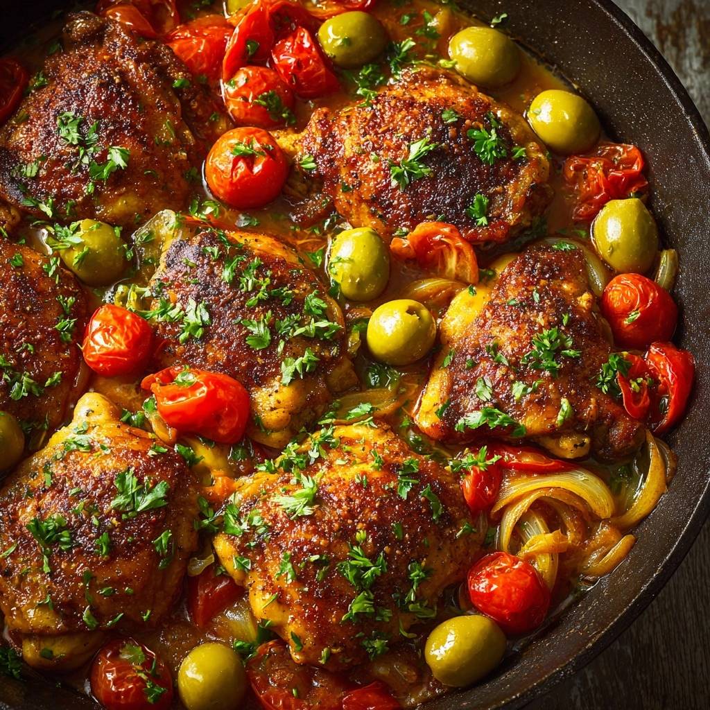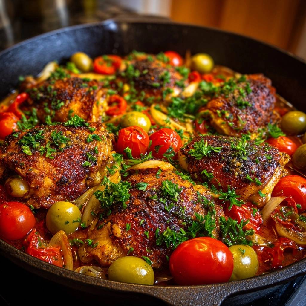 Crispy Skillet Chicken Thighs with Tomatoes and Olives