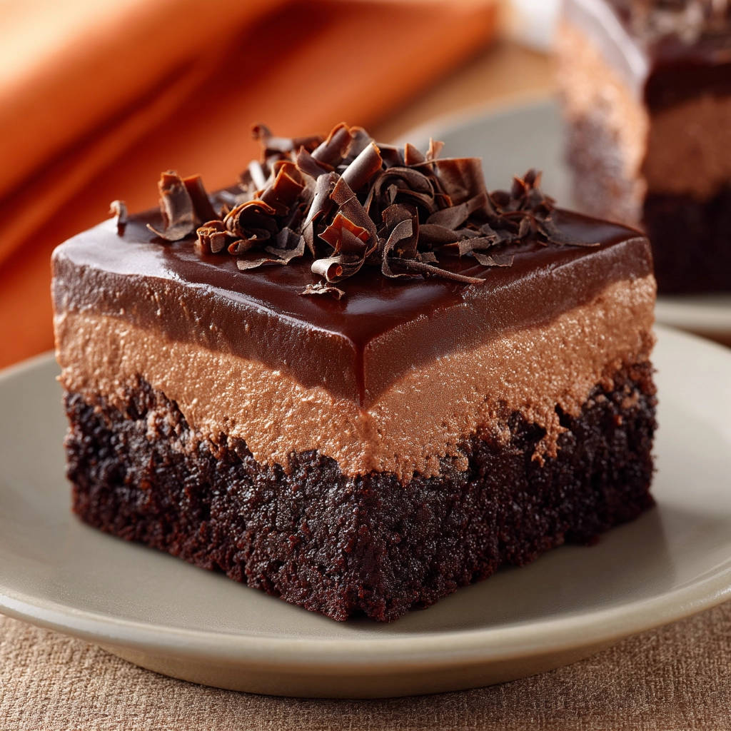 - Once cake is completely cooled, frost with chocolate mousse, then drizzle with chocolate ganache. Sprinkle with chocolate shavings. Chill for at least 30 minutes before serving.