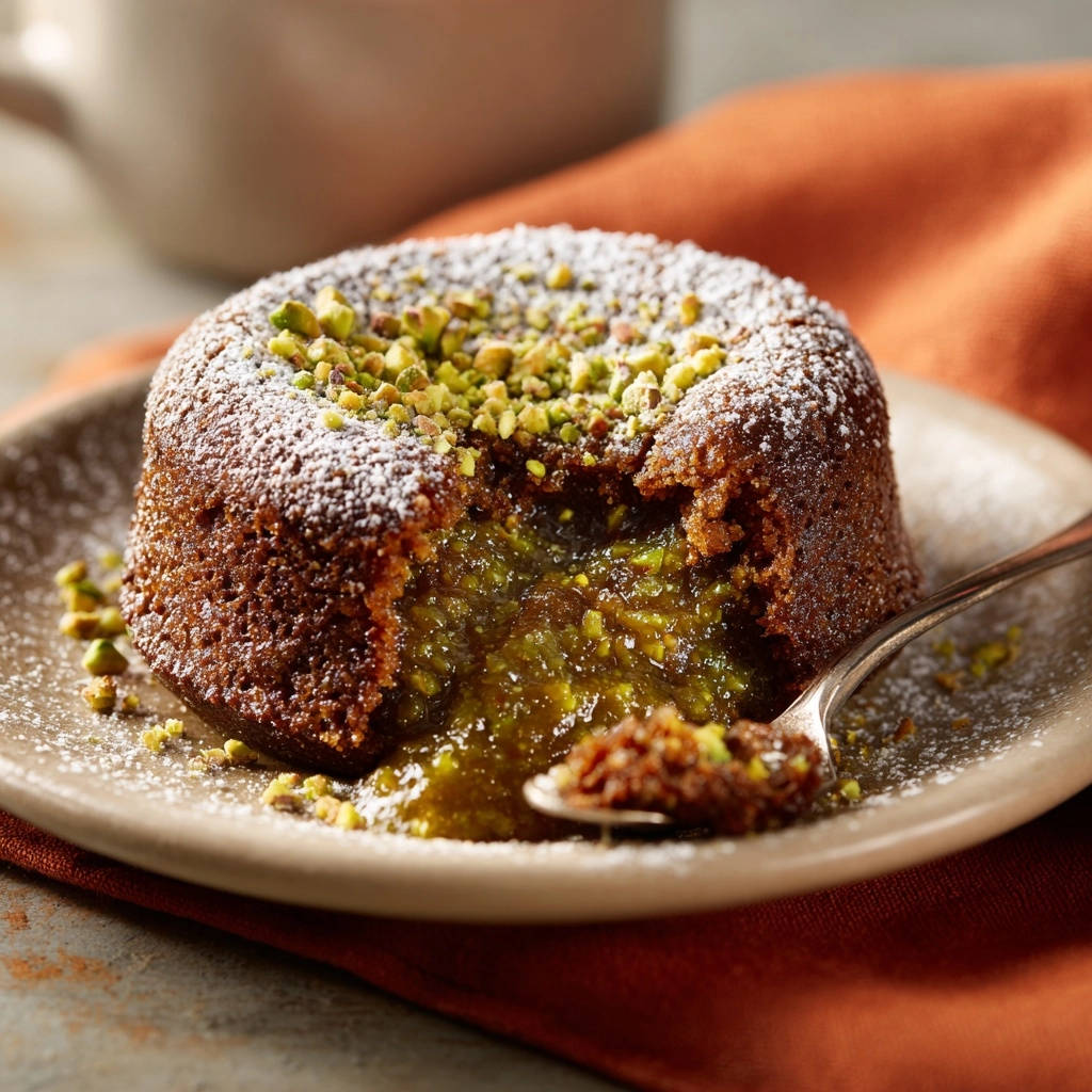 - Dust the tops of the warm cakes generously with powdered sugar and sprinkle with chopped pistachios before serving immediately. Enjoy that perfect molten middle!