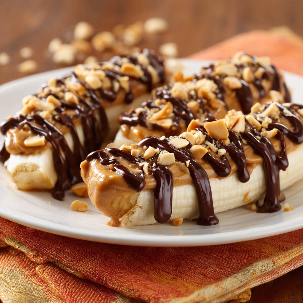 Prep Your Bananas: Start by peeling your two ripe bananas. If your bananas are quite long, you’ll want to cut them in half horizontally first. This gives you more manageable lengths for slicing. Then, take each piece (either the original length if they were short, or the halves) and slice it lengthwise. Think of it like cutting a hot dog bun – you’re opening it up. This gives you four elongated flat surfaces per banana, perfect for loading up with peanut butter and chocolate. Arrange these banana pieces on a plate or a serving platter. A plate is fine if serving immediately, but a platter is great if you want to chill them briefly or serve them to guests. The goal here is simply to prepare the banana base and lay it out, creating a stable surface for the next steps.