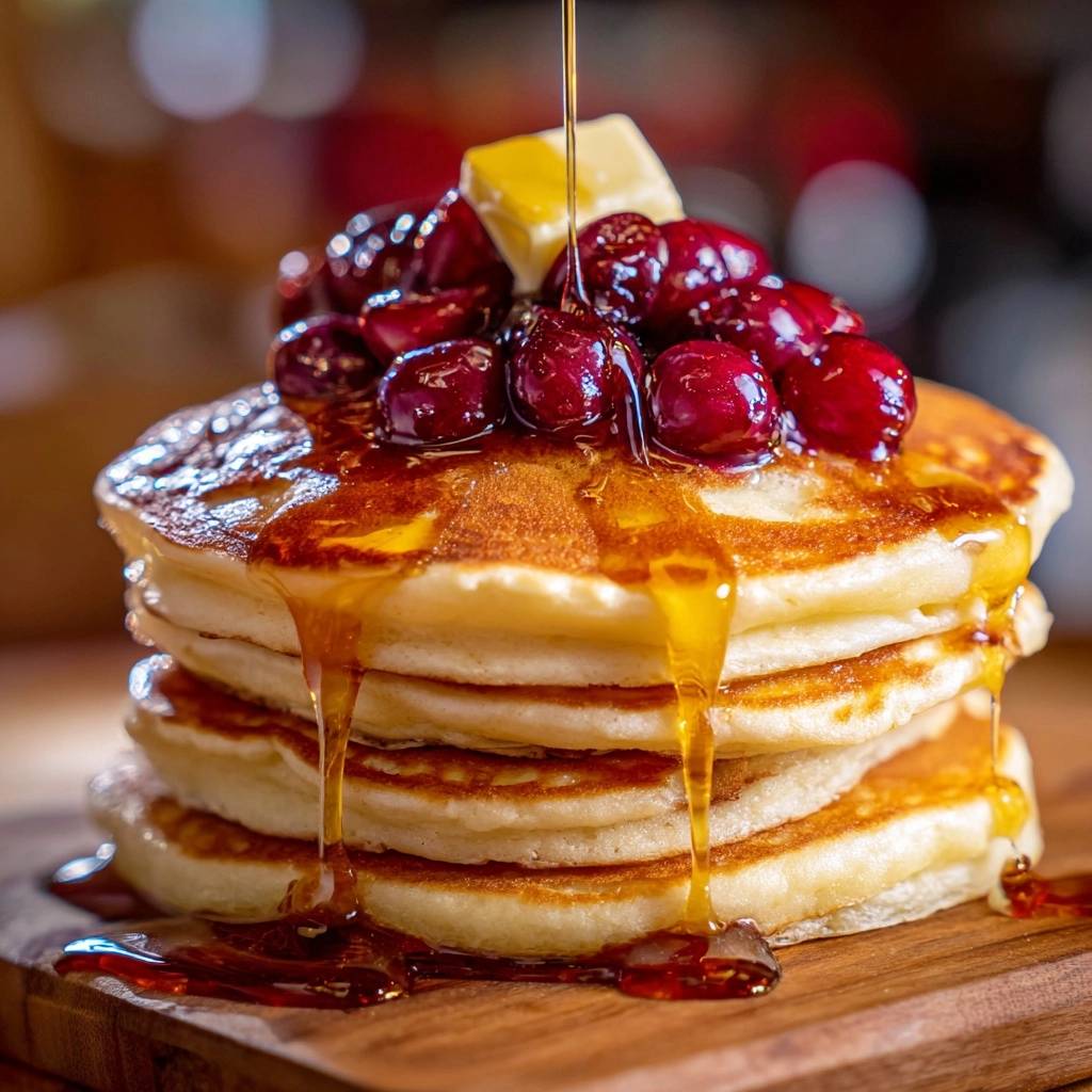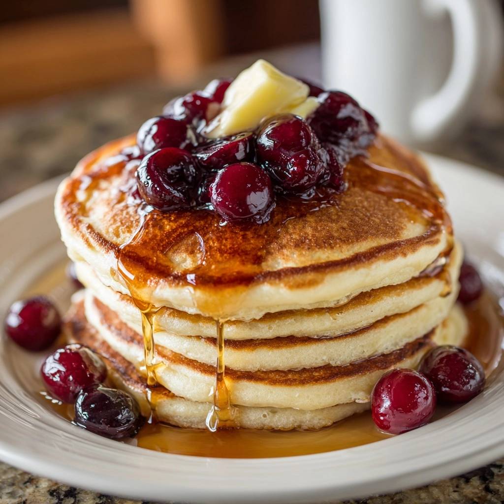 - Stack pancakes on plates. Top with fresh cherry halves, a pat of butter, and drizzle generously with maple syrup. Serve immediately for that perfect melt-in-your-mouth texture.
