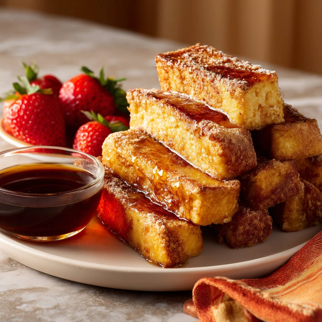 Serve Immediately: The moment they come off the pan is the prime time! Arrange the golden French toast sticks on a serving plate. Dust them generously with powdered sugar – it adds a touch of elegance and extra sweetness. Serve them immediately with warm maple syrup for dipping (because is it even French toast without maple syrup?!) and a side of fresh strawberries for a bright, fruity contrast. Other berries or sliced fruit also work beautifully.