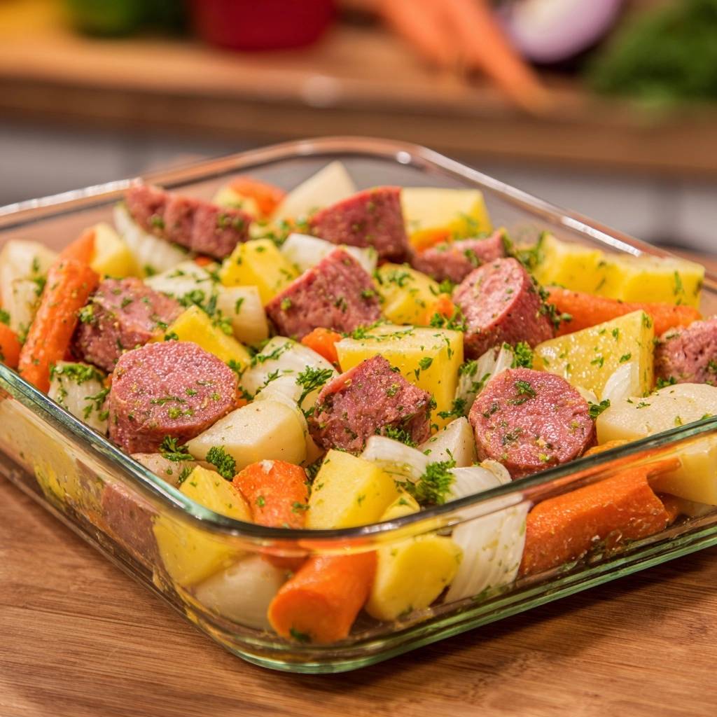 Glass Dish Sausage and Root Vegetable Medley