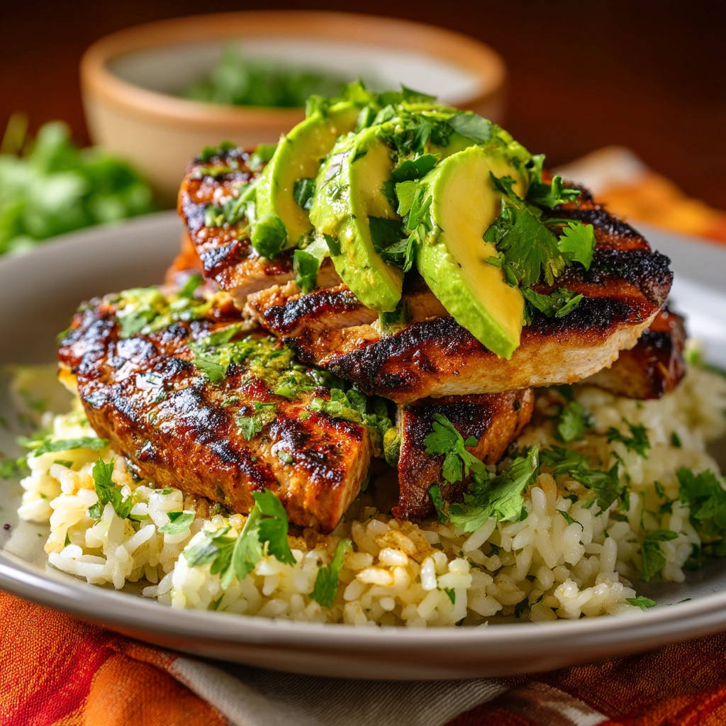 - Serve: Slice the chicken breasts and serve over cilantro rice. Garnish with sliced avocado.