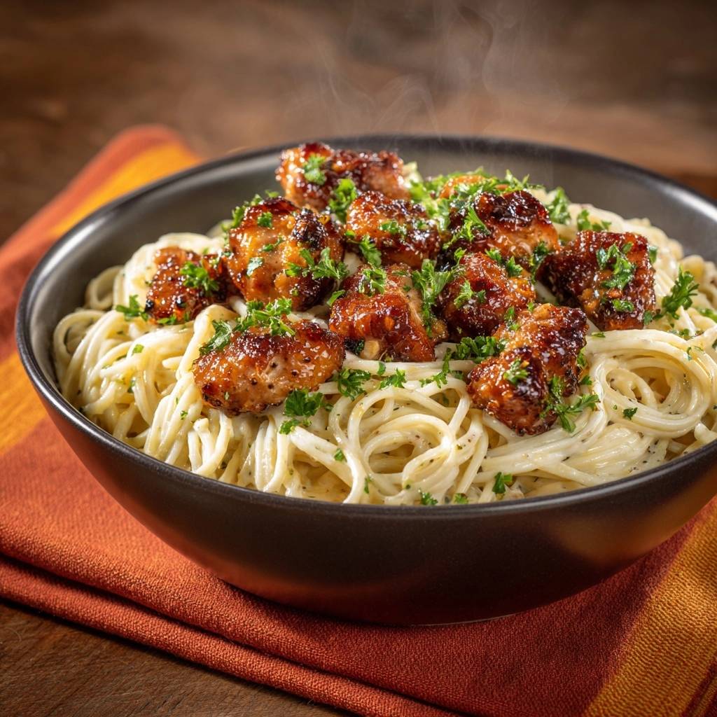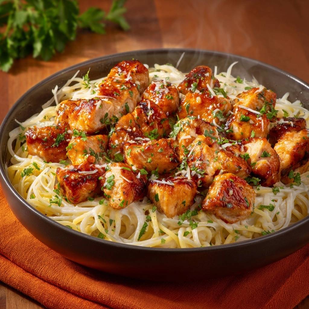 Return chicken to skillet, toss 1-2 minutes in glaze till sticky and shining. Add prepped spaghetti; gently mix to coat lightly. Off heat, sprinkle parsley. Serve hot in bowls for peak juiciness.