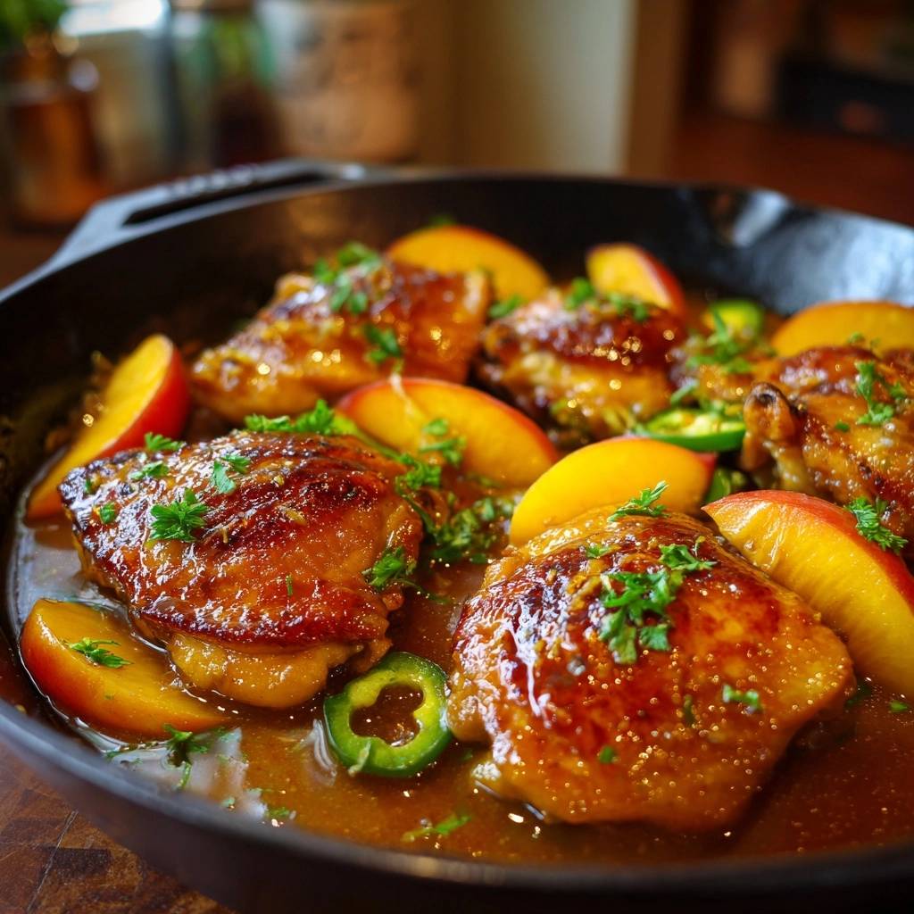 The magic lies in the sensory contrast between the sharp, stinging heat of fresh jalapenos and the mellow, floral sweetness of ripe peaches. By using bone-in, skin-on thighs, we ensure the meat stays incredibly juicy during the reduction process. The bone acts as an insulator, while the skin provides the structural integrity needed to hold up against the bold flavors of the peach glaze.