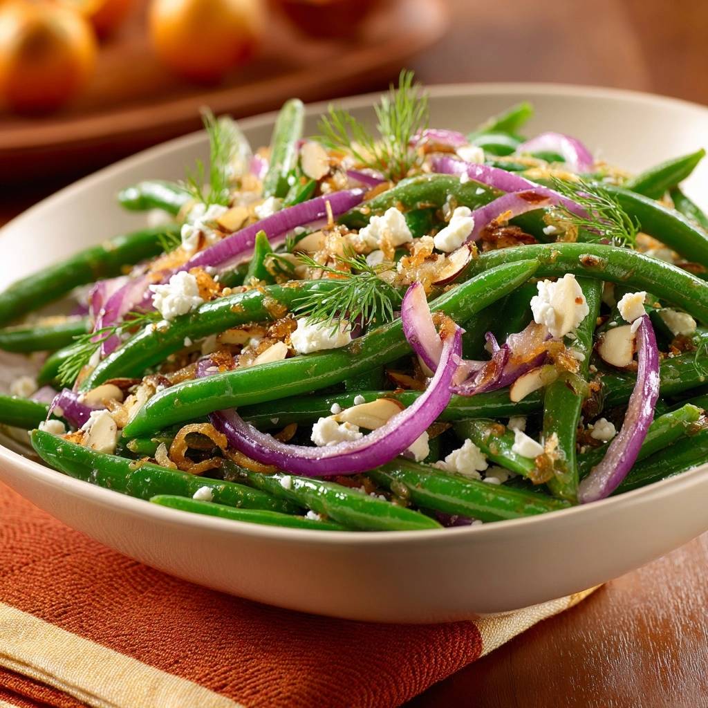 - Assemble the salad: In a large bowl, gently toss blanched green beans with warm caramelized onions. Drizzle with remaining 1 tablespoon olive oil. Sprinkle evenly with crumbled feta, toasted almonds, and chopped dill. Serve warm or at room temperature.