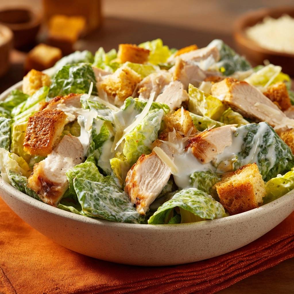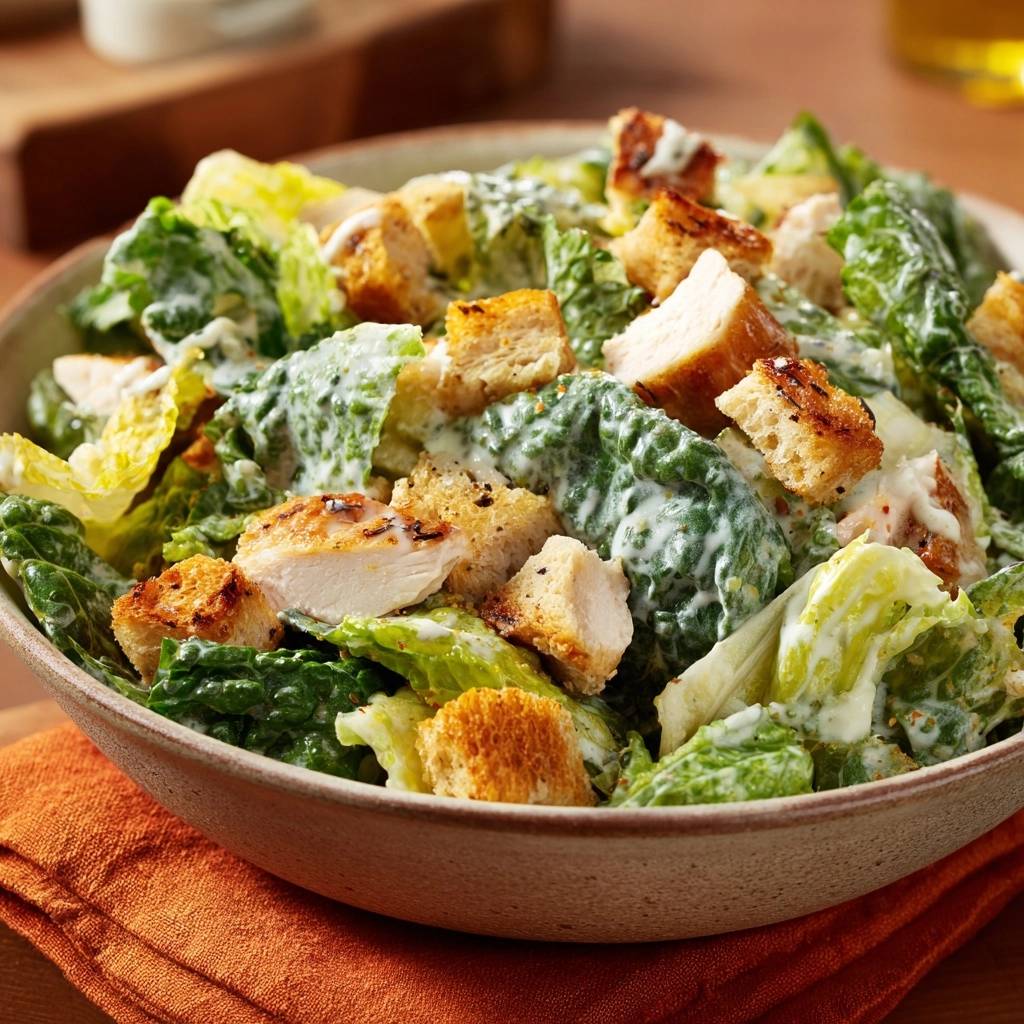 The Caesar salad started as a simple chopped romaine toss with bold dressing. However, adding grilled chicken brings smoky depth that poached versions lack. Romaine hearts hold up best under dressing, staying crisp longer than leafier greens.