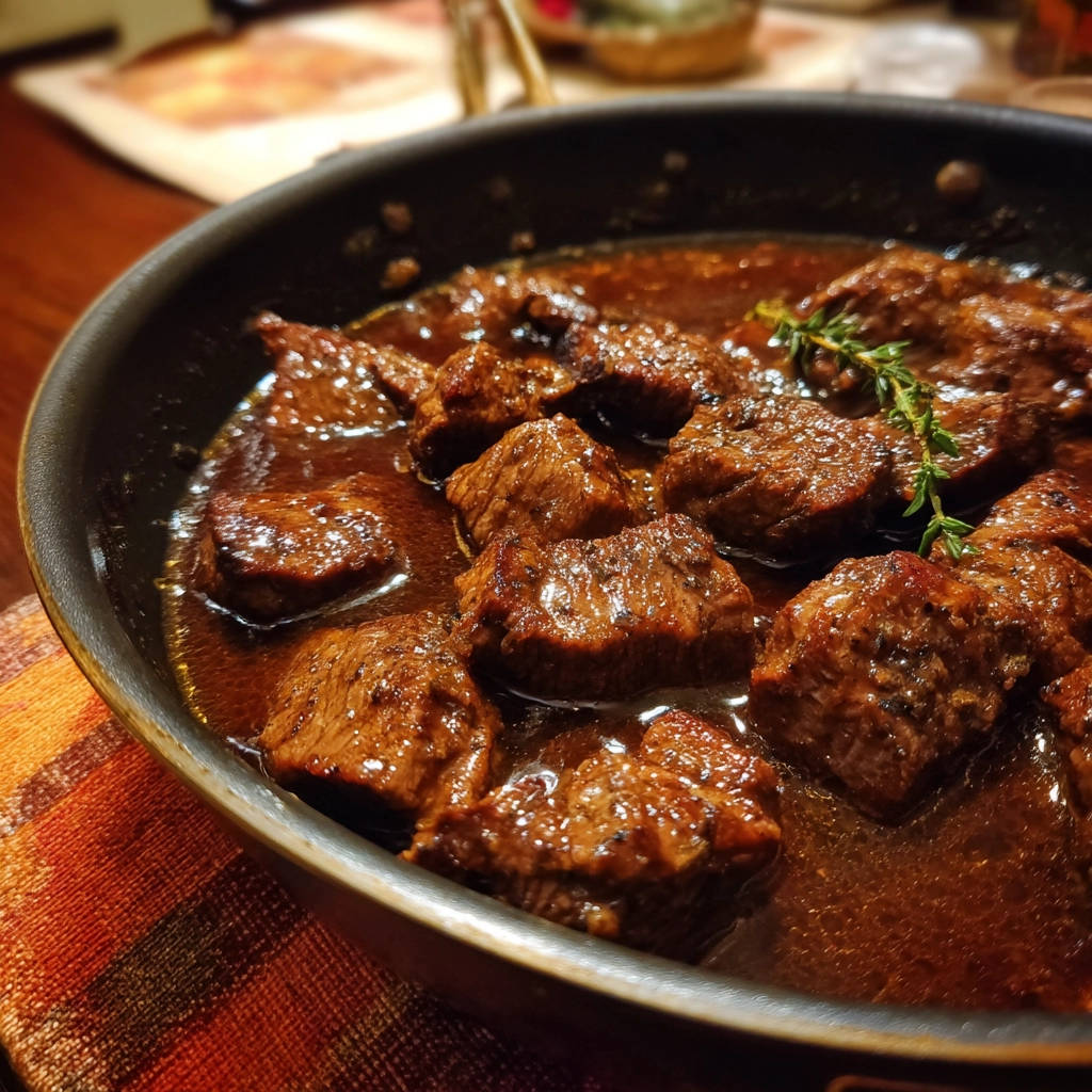 - Taste the sauce and adjust seasoning with more salt and pepper if needed. Remove the thyme sprig before serving. Serve the tender beef and rich sauce hot.