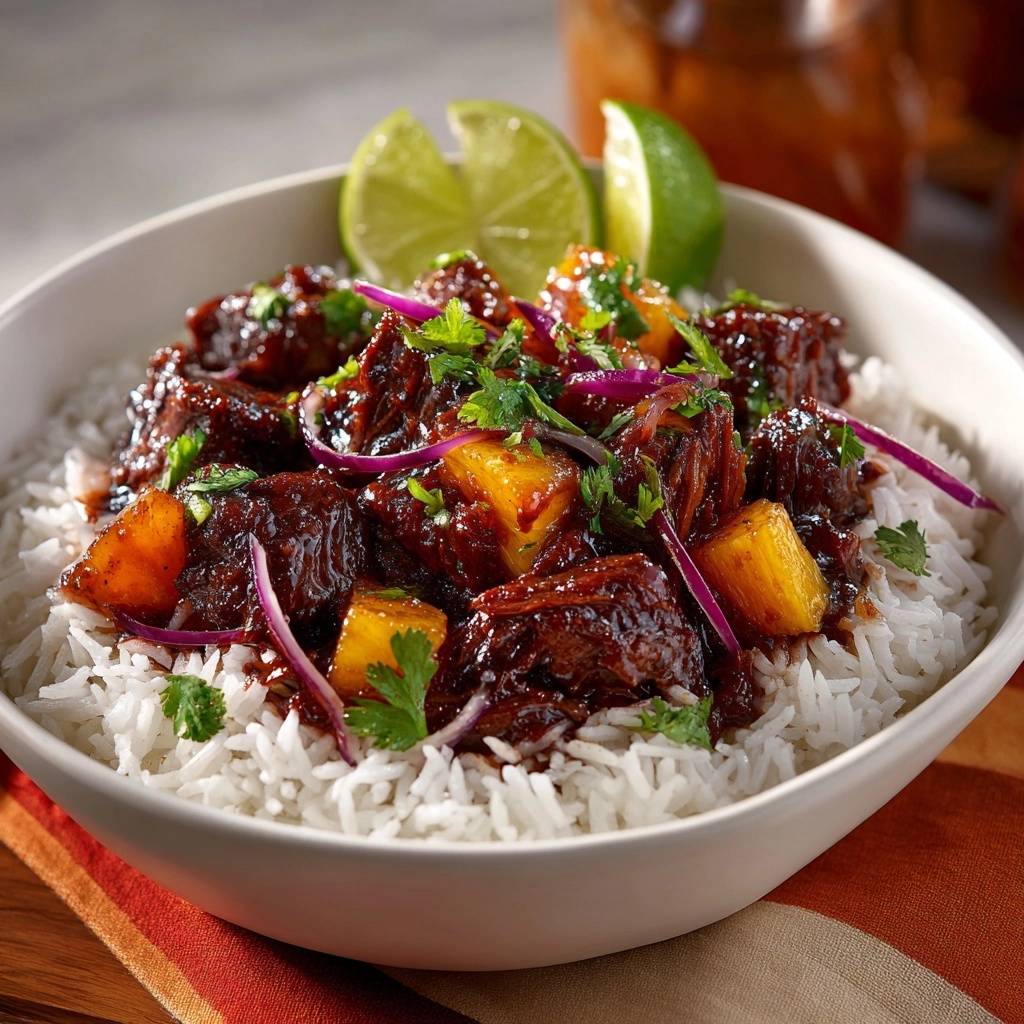 - Build and Braise: Lower heat to medium. Add sliced onion and remaining 2 cups pineapple chunks to pot, saute 4 minutes until softened. Return beef and reserved marinade to pot, add pineapple juice. Bring to simmer, cover, reduce to low, and braise 1.5 hours until beef shreds easily with fork. Sauce thickens naturally from pineapple sugars and marinade.