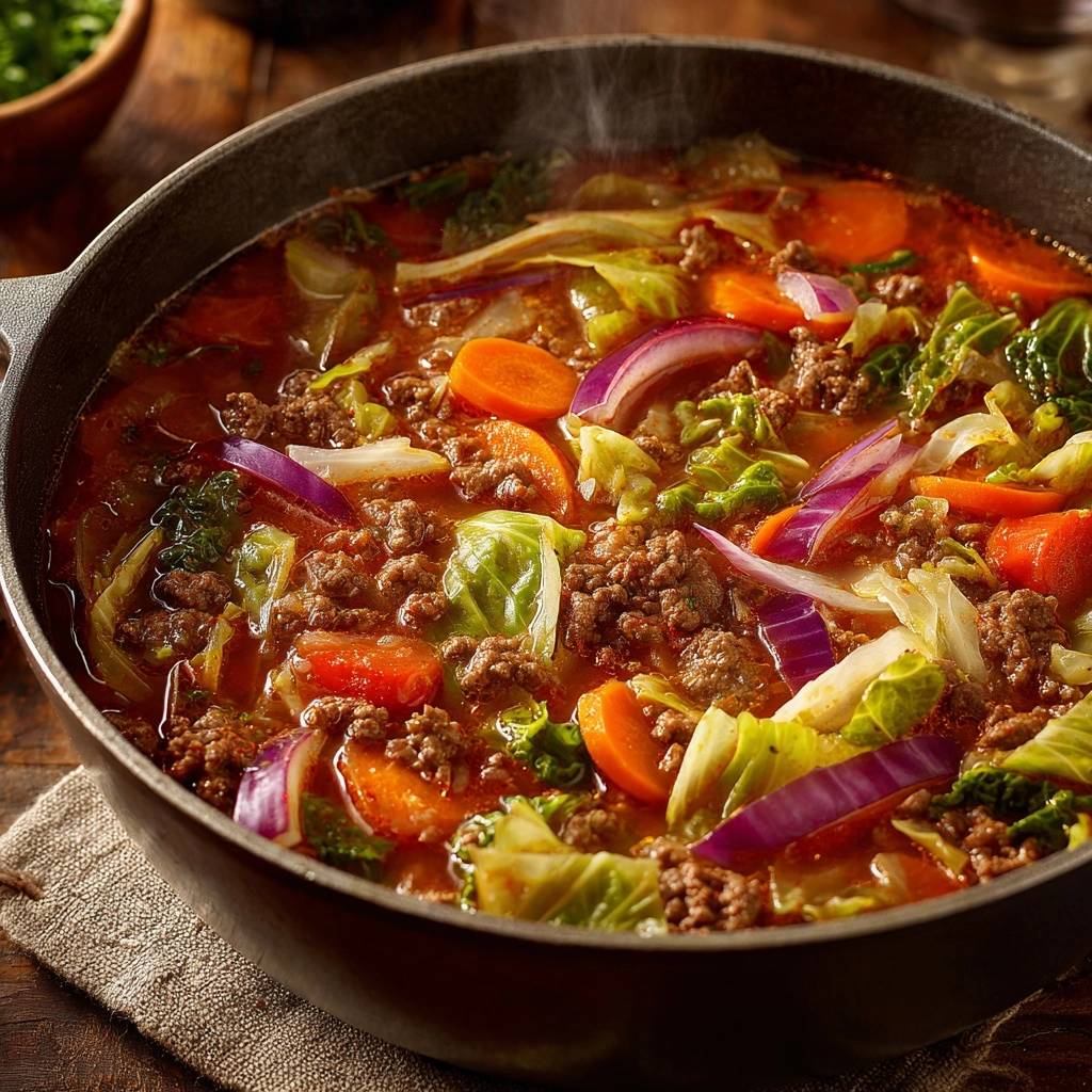 A sharp chef’s knife slices cabbage and carrots uniformly for even cooking. Use a wooden spoon to crumble beef without scratching. A tight lid traps steam during simmer.