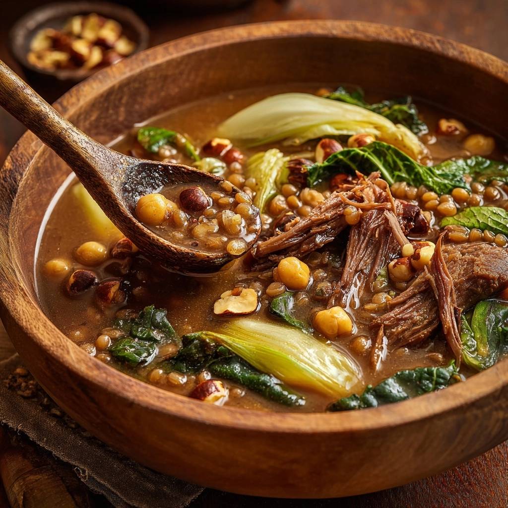 - Shred beef directly in pot with two forks. Taste and adjust salt/pepper. Ladle into bowls, top with toasted hazelnuts for crunch. Serve hot.