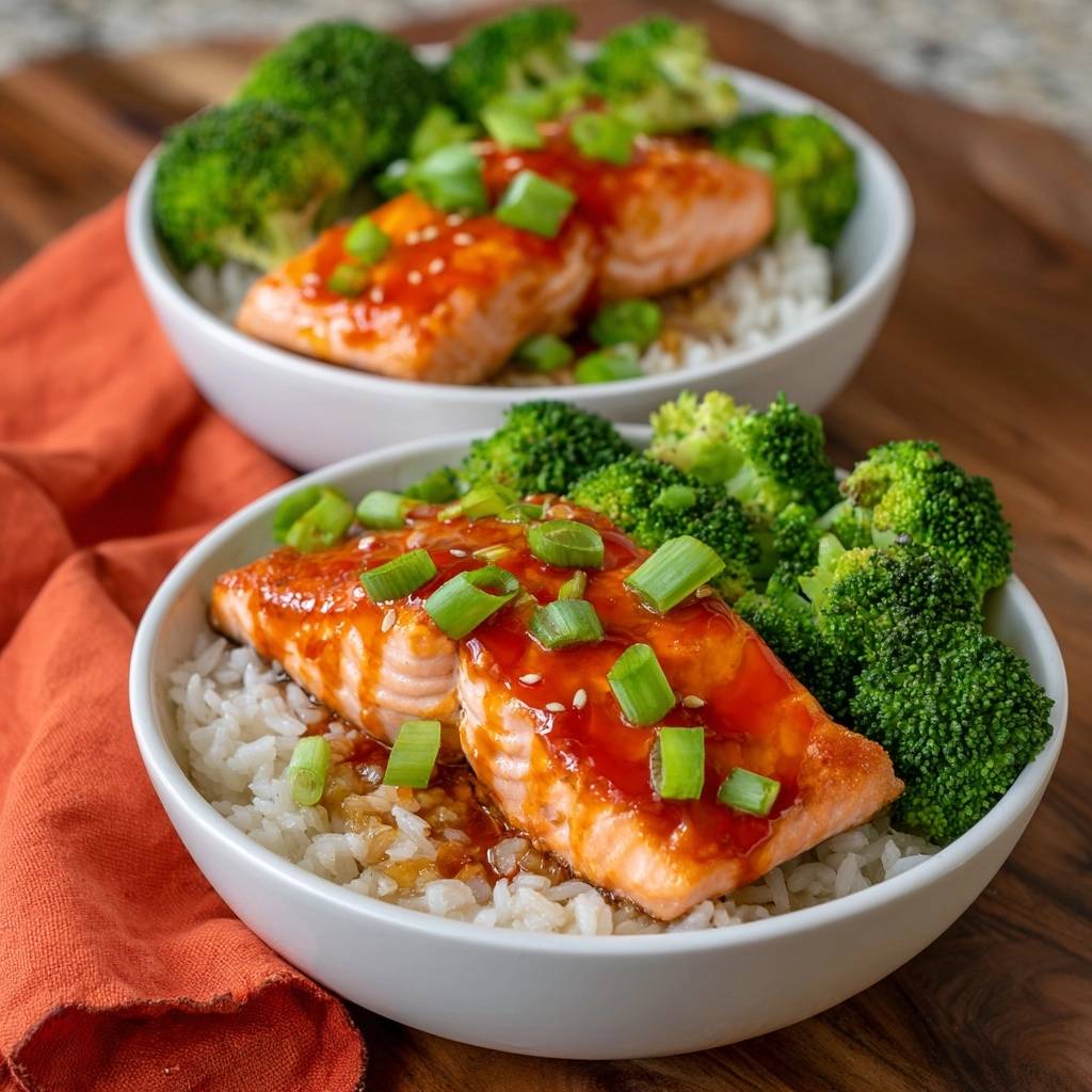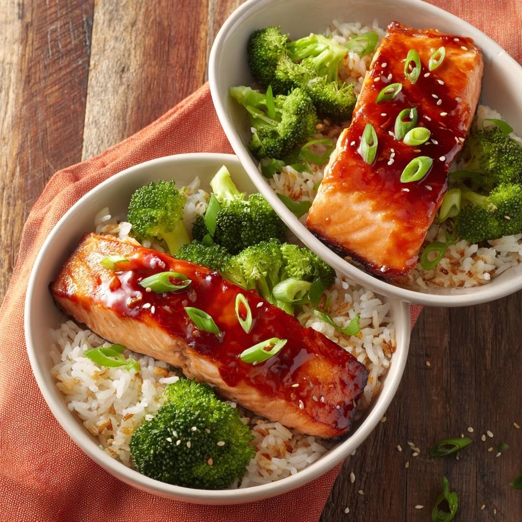 - Divide rice into two bowls. Top with broccoli, salmon, sliced green onions, and sesame seeds. Drizzle with reserved glaze. Serve immediately.