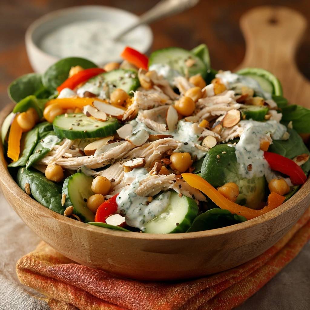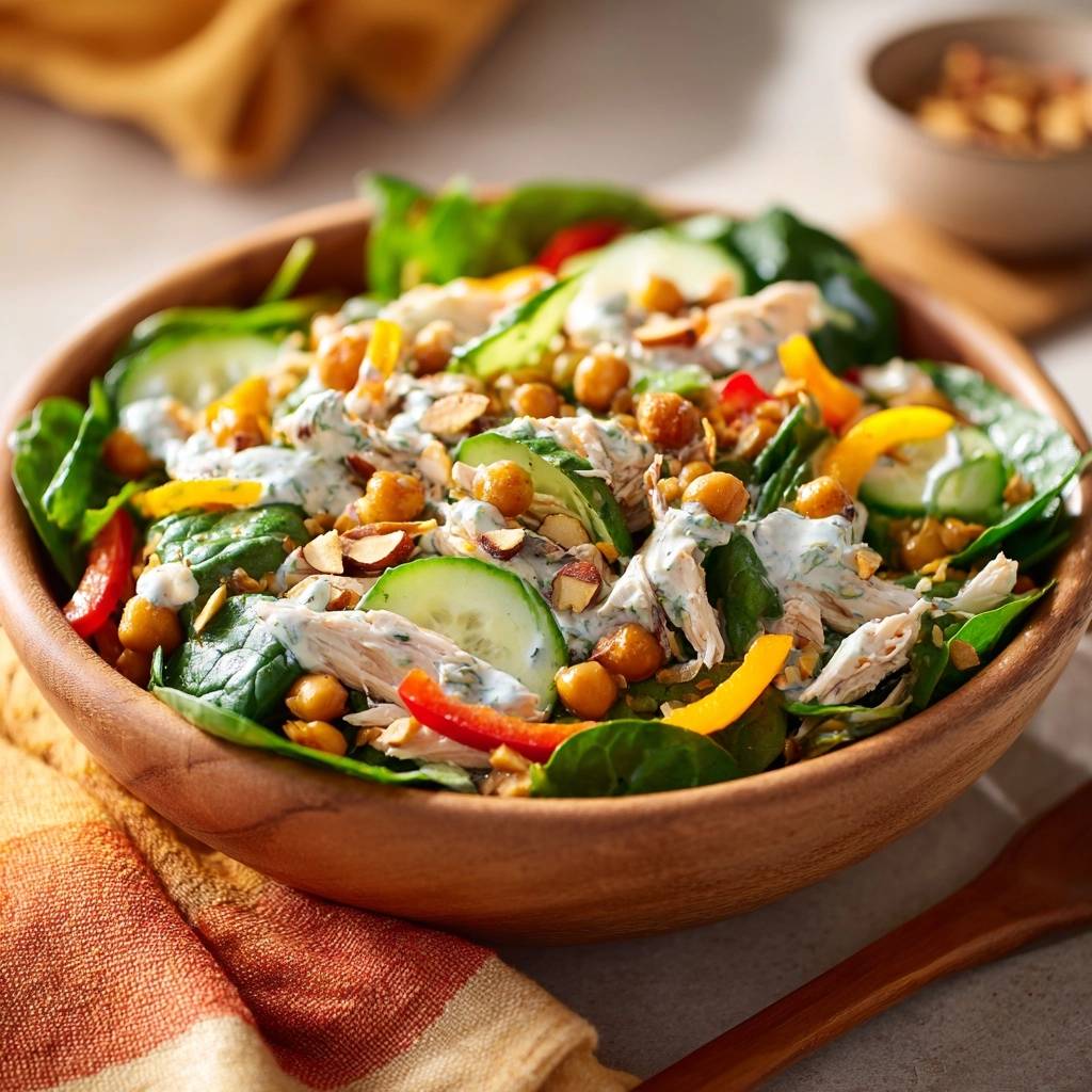 - Assemble salad: In a large wooden bowl, layer spinach, sliced cucumber, diced bell peppers, roasted chickpeas, toasted almonds, and shredded chicken. Drizzle with dressing and toss gently just before serving to keep greens crisp.