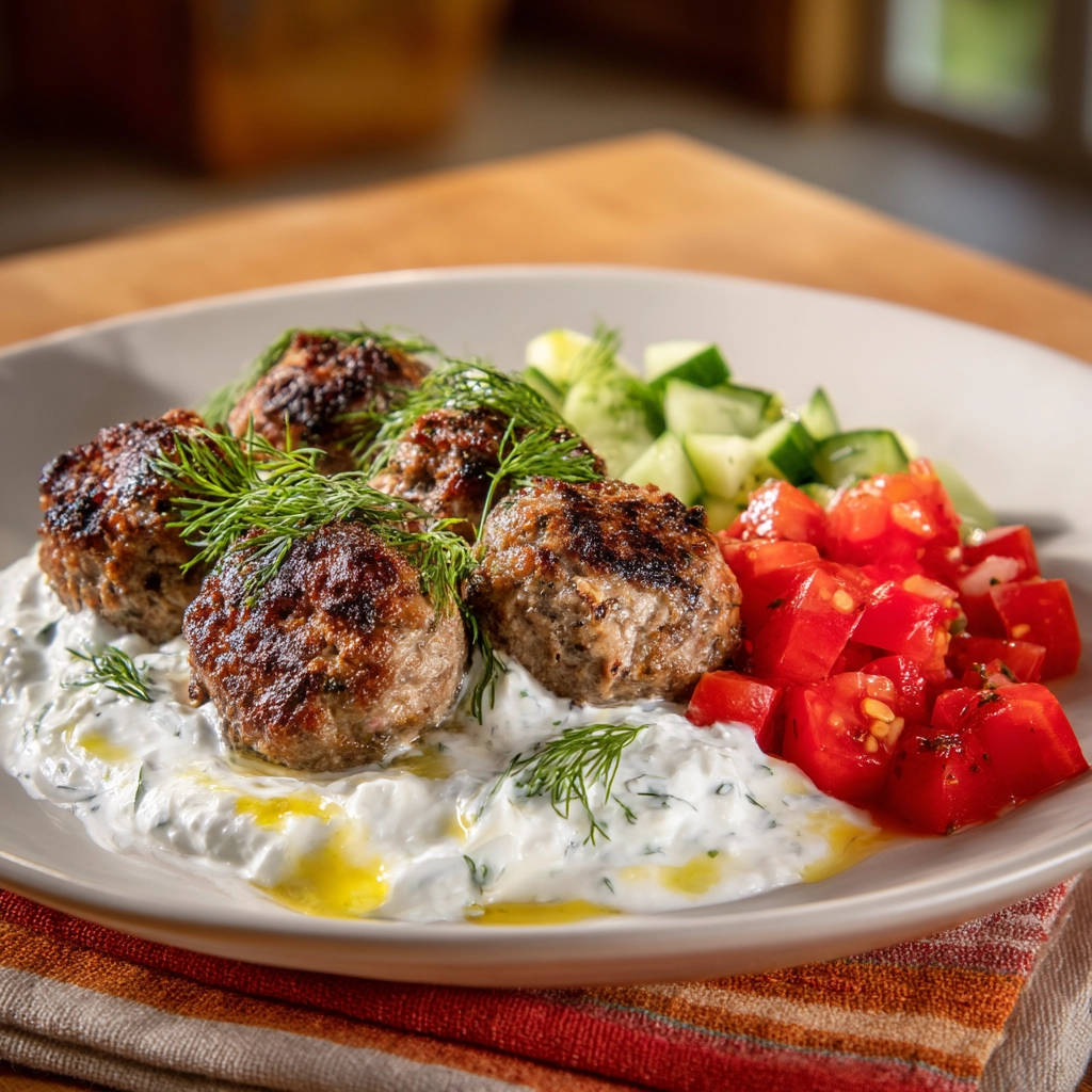 - Assemble the dish: Spoon a generous amount of the prepared tzatziki onto the bottom of a serving plate. Arrange the cooked keftedes on top of the tzatziki.