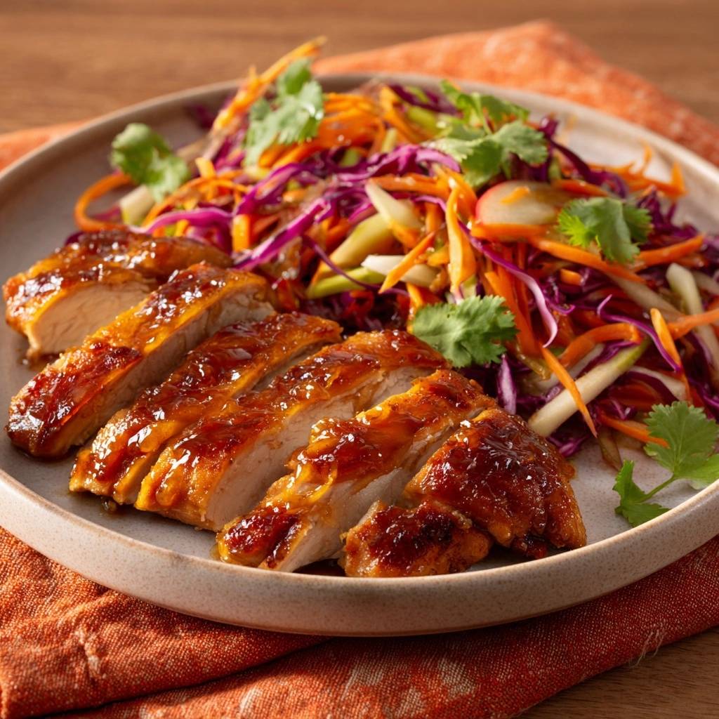 Store sliced chicken and slaw separately in airtight containers in the fridge for up to 3 days. Reheat chicken gently in a skillet with a splash of water to revive glaze. Don’t freeze; slaw soggies and chicken dries upon thaw.