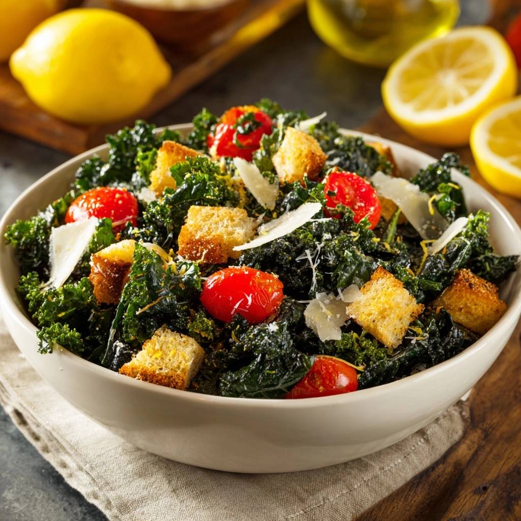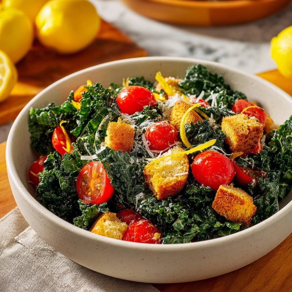 Start croutons to elevate your Lemon Parmesan Kale Salad’s texture. Preheat to 375°F, toss 1 cup bread cubes with 2 tablespoons olive oil, salt, and pepper. Bake 8-10 minutes, stirring halfway for even goldeness.