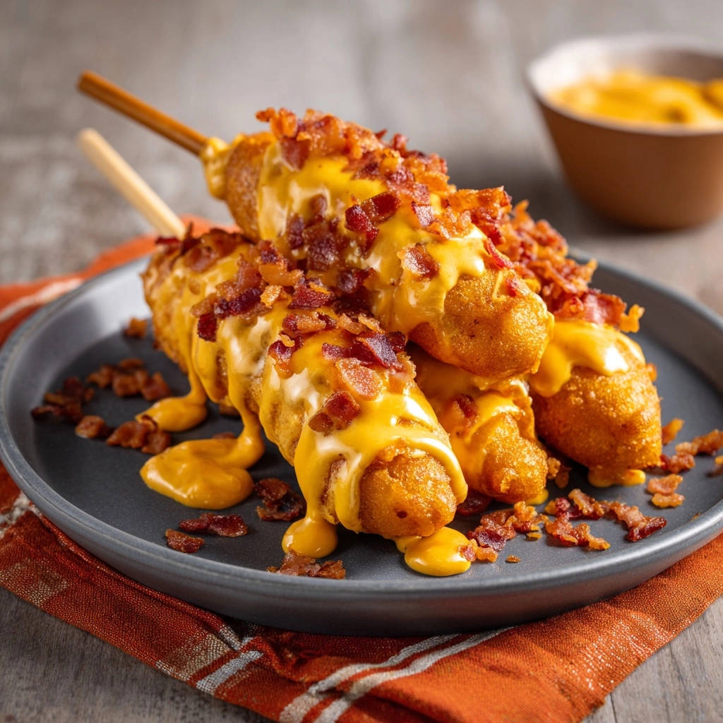 - Serve: Arrange the crispy mini corn dogs on a serving platter. Drizzle generously with the warm cheese sauce and sprinkle with cooked and crumbled bacon. Serve immediately.