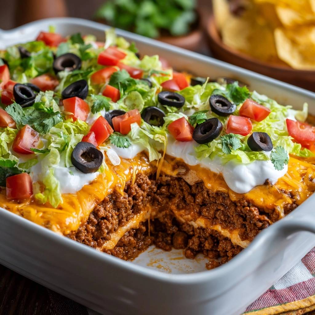 Phase 4: Layer tortillas, beans, beef, cheese in thirds. Bake 20-25 minutes till golden. Phase 5: Rest 5 minutes, then top fresh. Each step builds loaded taco casserole success.