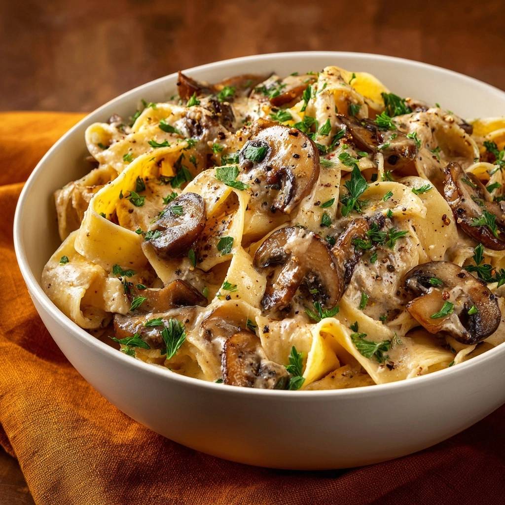 Pappardelle is a wide, flat egg noodle that originated in Tuscany. Its broad surface area is specifically designed to carry heavy, chunky sauces. While spaghetti or linguine would simply get lost under the weight of the mushrooms and cream, pappardelle acts like a canvas, catching every bit of garlic and cheese in its folds.