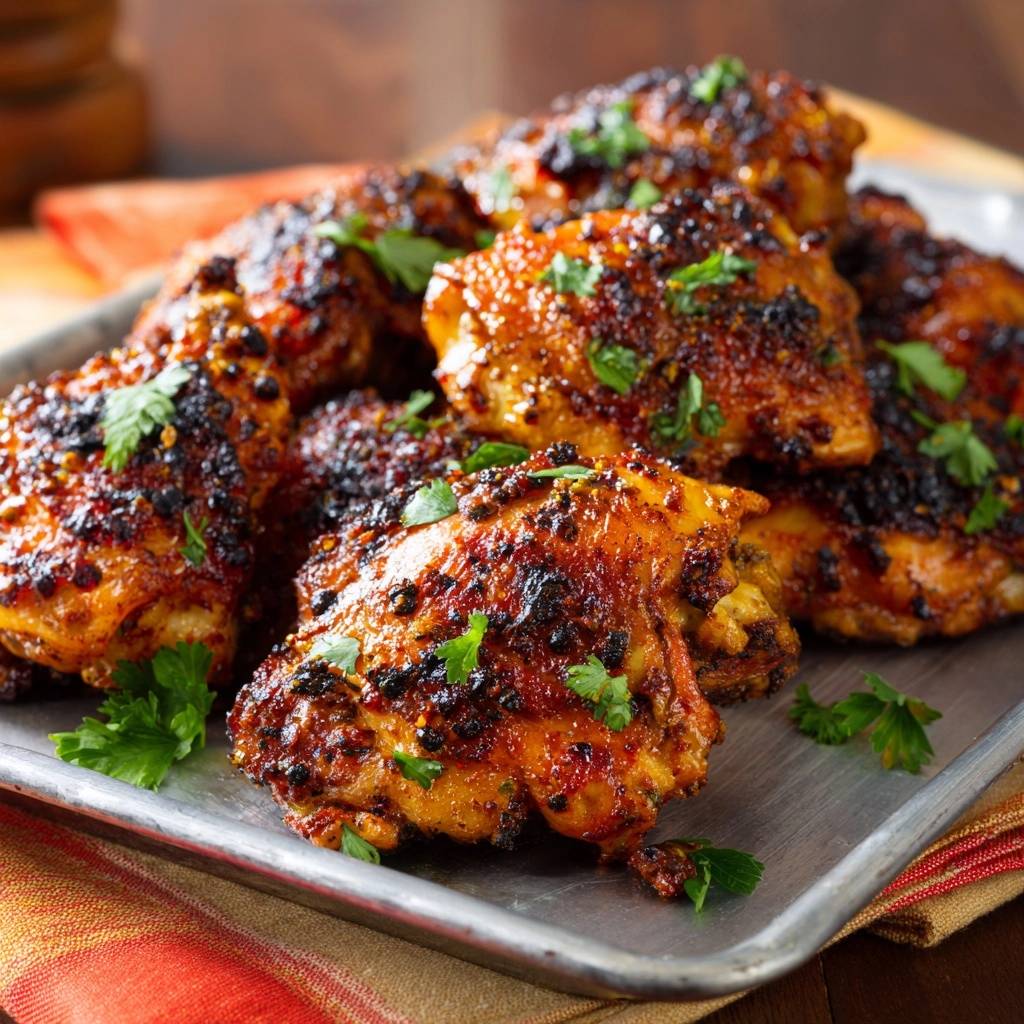 - Check that the internal temperature has reached 170°F-175°F (thighs are more tender at a slightly higher temp than breasts). To match the charred look in the photo, switch the oven to Broil for the final 2-3 minutes, watching closely to ensure the spices darken without burning.