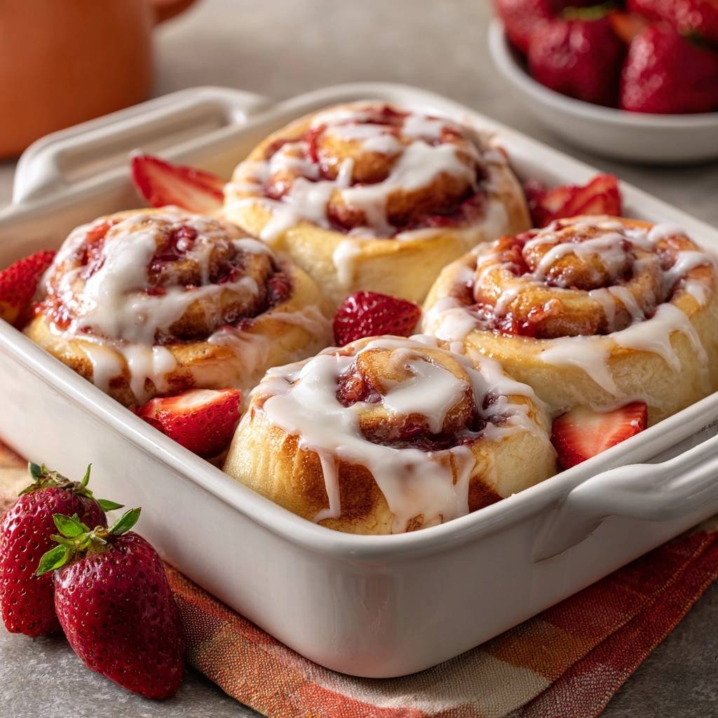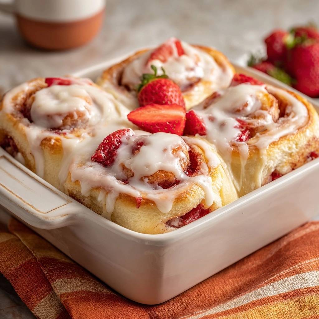 - Drizzle the thick glaze generously over the rolls, allowing it to pool in the spirals. Garnish with the remaining fresh strawberry slices and serve immediately.