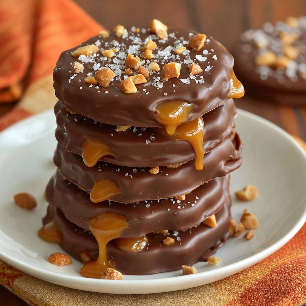 To get perfectly uniform circles, you can draw 2.5-inch circles on a piece of paper and slide it under your parchment as a template. This ensures every disc is the exact same size. Just remember to slide the paper out before putting the tray in the fridge! For a truly high-end look, use a toothpick to swirl a tiny bit of the caramel into the top chocolate layer before it sets.
