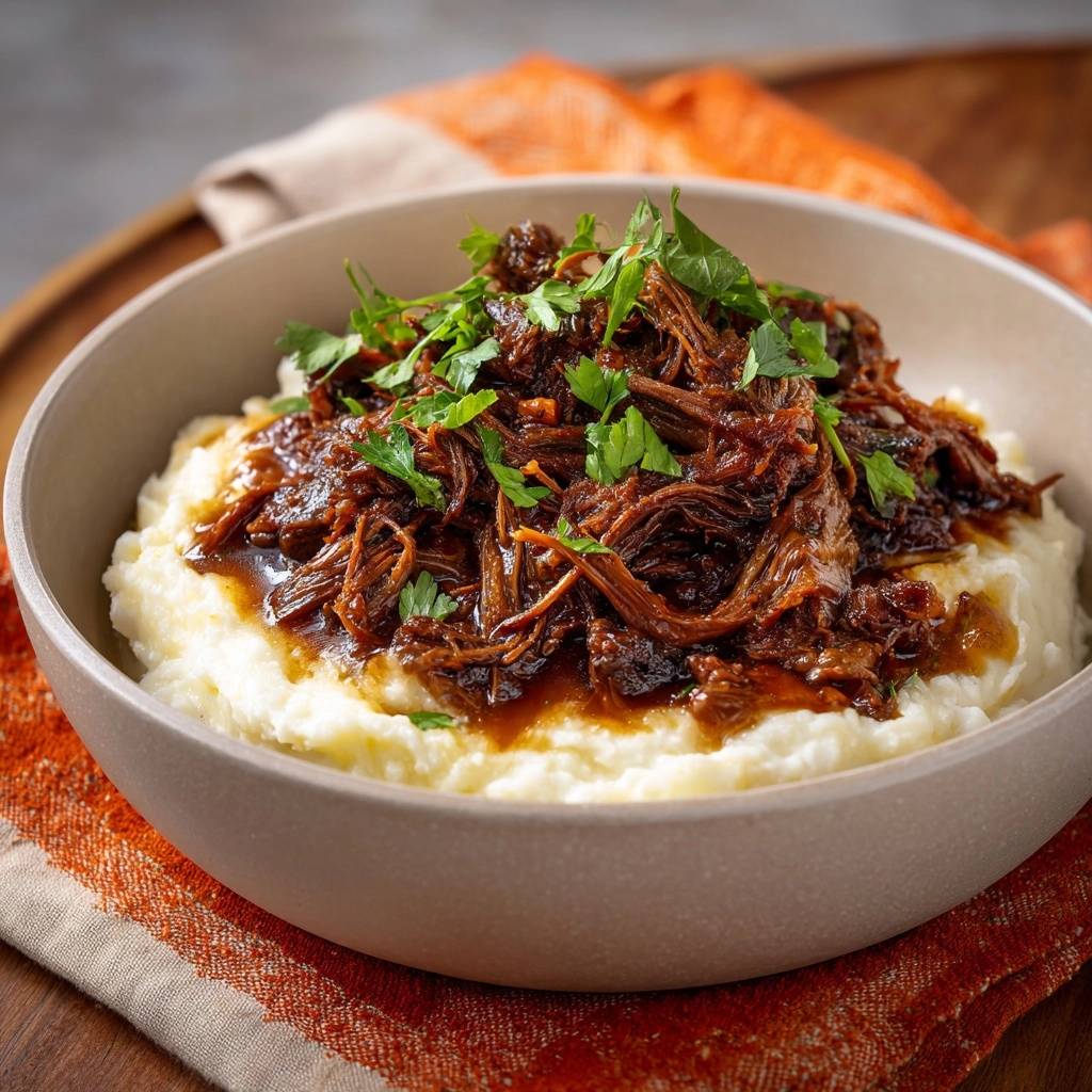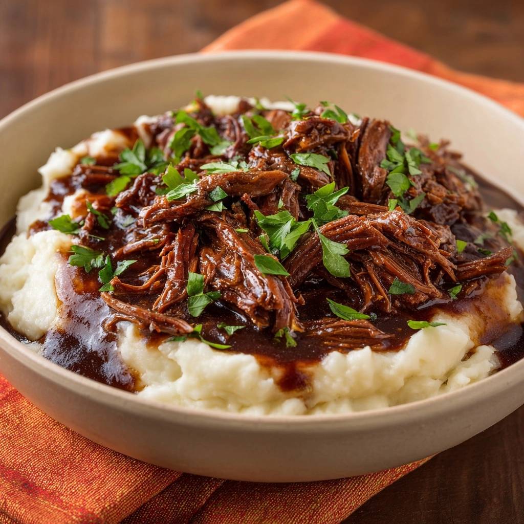 - Serve a generous portion of shredded beef over a large bed of mashed potatoes. Ladle the rich gravy over the top so it pools into the potatoes. Garnish heavily with fresh chopped parsley.