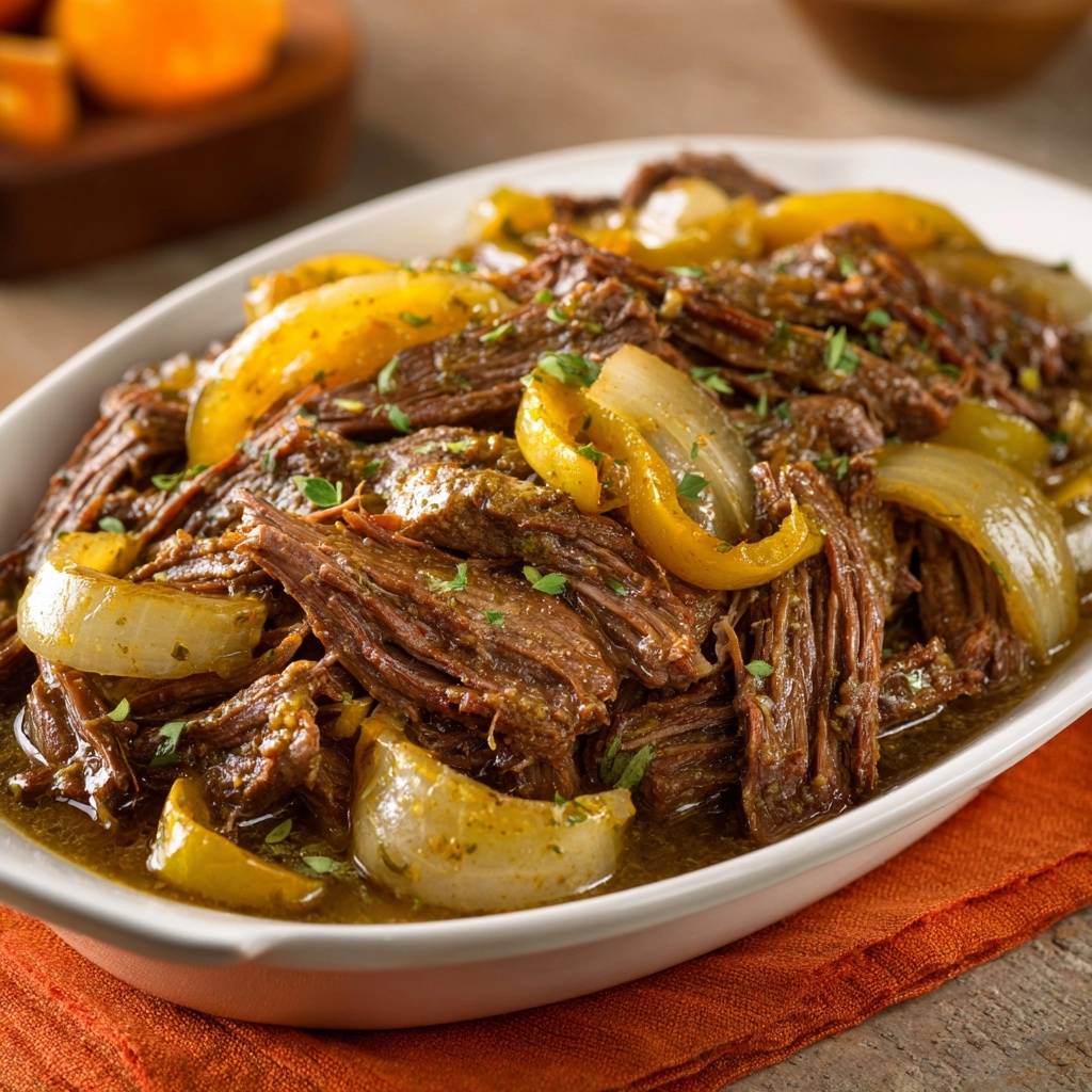 For long-term storage, this beef freezes exceptionally well. I recommend freezing the shredded beef and the liquid together in a freezer-safe bag, pressing out as much air as possible. You can freeze the peppers and onions as well, though they will be softer upon reheating. To reheat, do so gently on the stovetop over low heat. Avoid the microwave if possible, as it can toughen the beef fibers and make them feel rubbery.