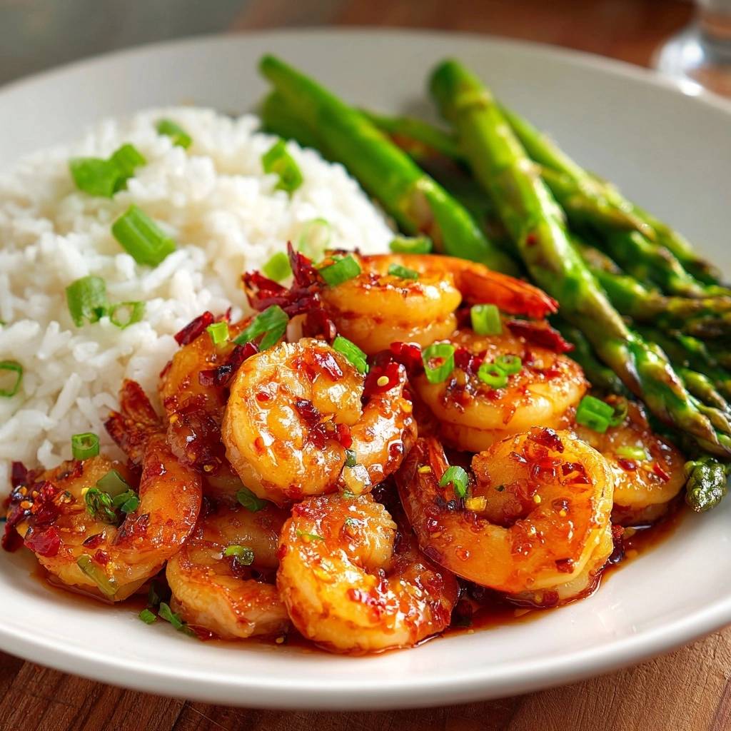 - Plate the fluffy white rice and charred asparagus. Arrange the glazed shrimp over the rice, drizzling any remaining spicy oil and sauce from the pan over the top. Garnish generously with sliced green onions.