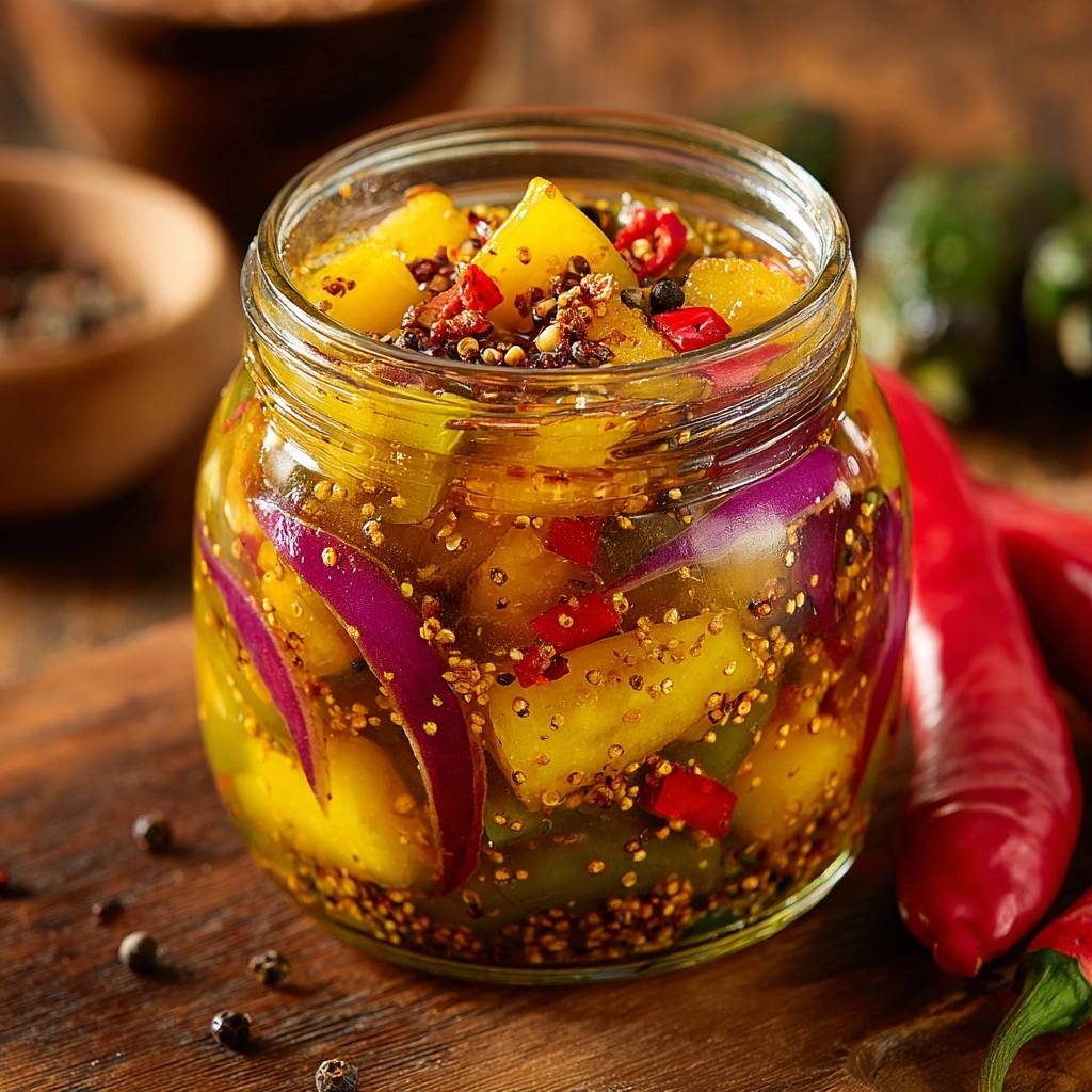 This Spicy Pickled Mango and Red Onion recipe is designed to be the ultimate “Anti-Soggy” solution for your pantry. We’ve balanced the natural, honey-like sweetness of the mango with the sharp, pungent snap of red onion and a creeping heat from fresh chilies. It’s a vibrant, crunchy powerhouse that brings a bright acidity to any meal without turning into a jar of fruit jam.