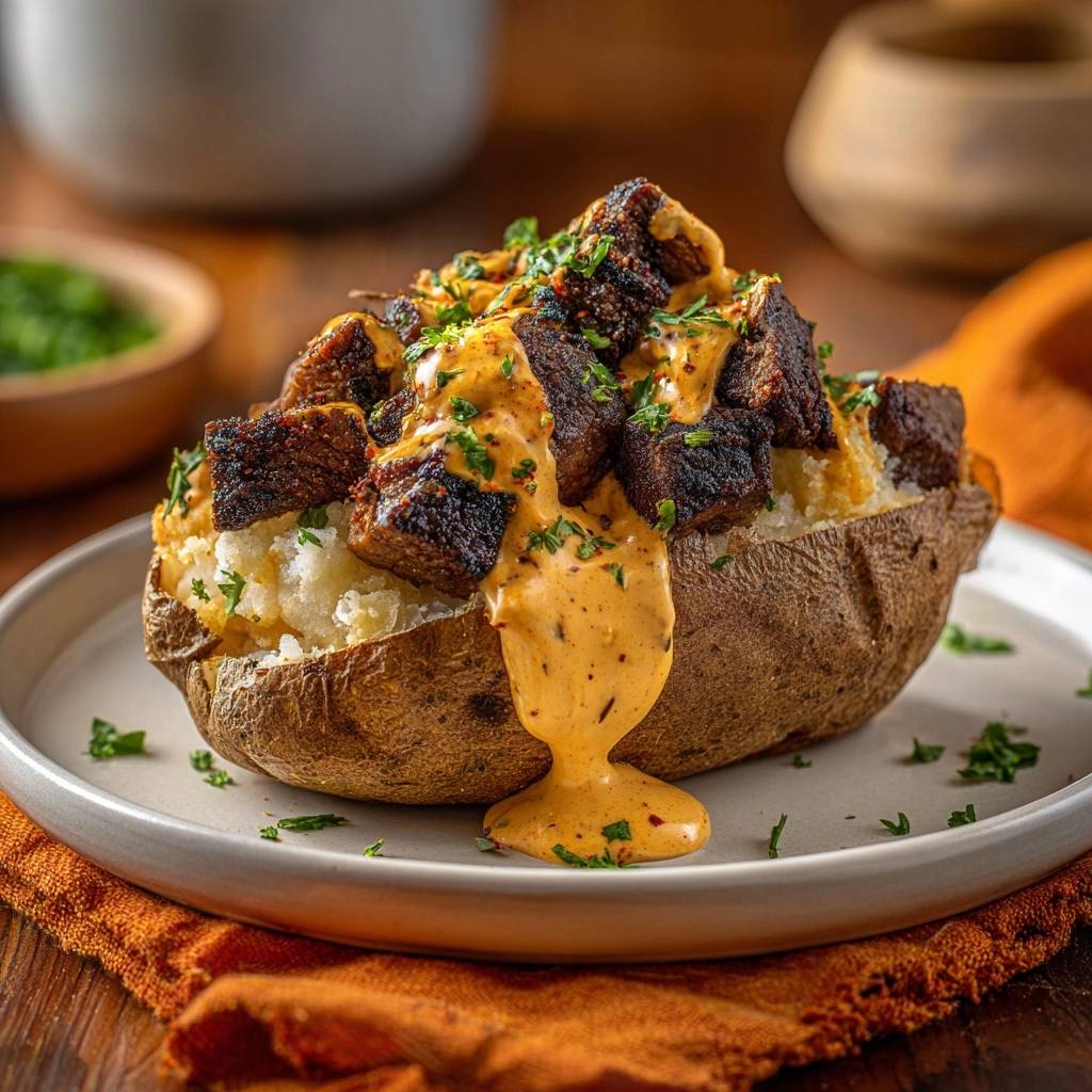 - Pile the seared steak bites high onto the fluffed potato. Drizzle the warm spiced queso generously over the steak so it cascades down the sides. Garnish with a heavy sprinkle of fresh parsley and a final pinch of smoked paprika. Serve immediately while the skin is at peak crunch.