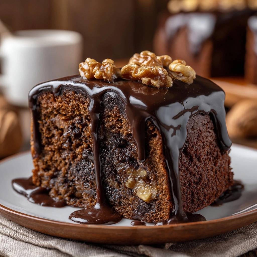 - Pour the chocolate ganache generously over the cooled loaf, allowing it to drip down the sides as seen in the image. Top immediately with whole walnut halves. Slice only once the ganache has set to maintain the structural integrity of the crumb.