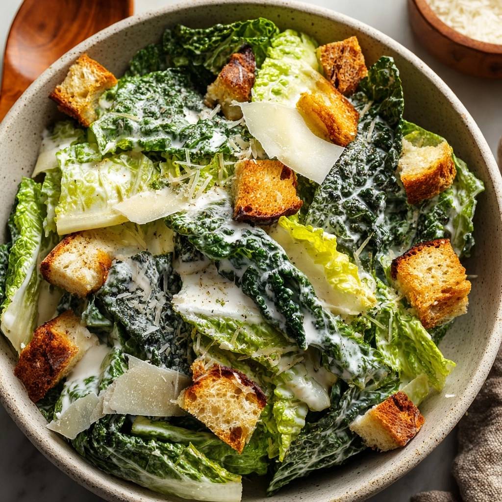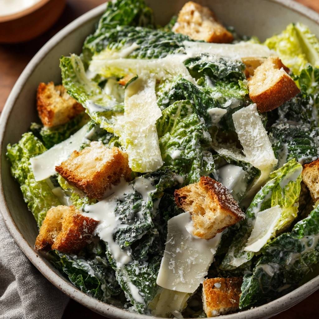 - The Final Assembly: Transfer to a chilled serving bowl. Top generously with the large shaved Parmesan flakes and the pan-seared croutons. Serve immediately to maintain the contrast between the creamy dressing and the ultra-crunchy elements.