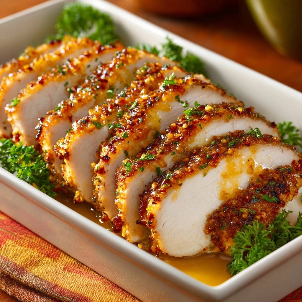 Finally, garnish heavily with fresh curly parsley. The bright green color makes the golden-brown crust of the Honey Mustard Glazed Turkey Roast pop. It’s a simple touch that makes a home-cooked meal look like it came straight from a professional kitchen.