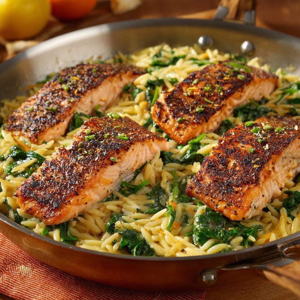 Since this skillet is quite rich and filling, I recommend sides that offer a crisp, acidic contrast. Charred asparagus is a classic pairing; the slight bitterness of the stalks cuts through the fatty salmon beautifully. A simple shaved fennel and arugula salad with a light vinaigrette also works wonders to cleanse the palate between bites of the savory orzo.