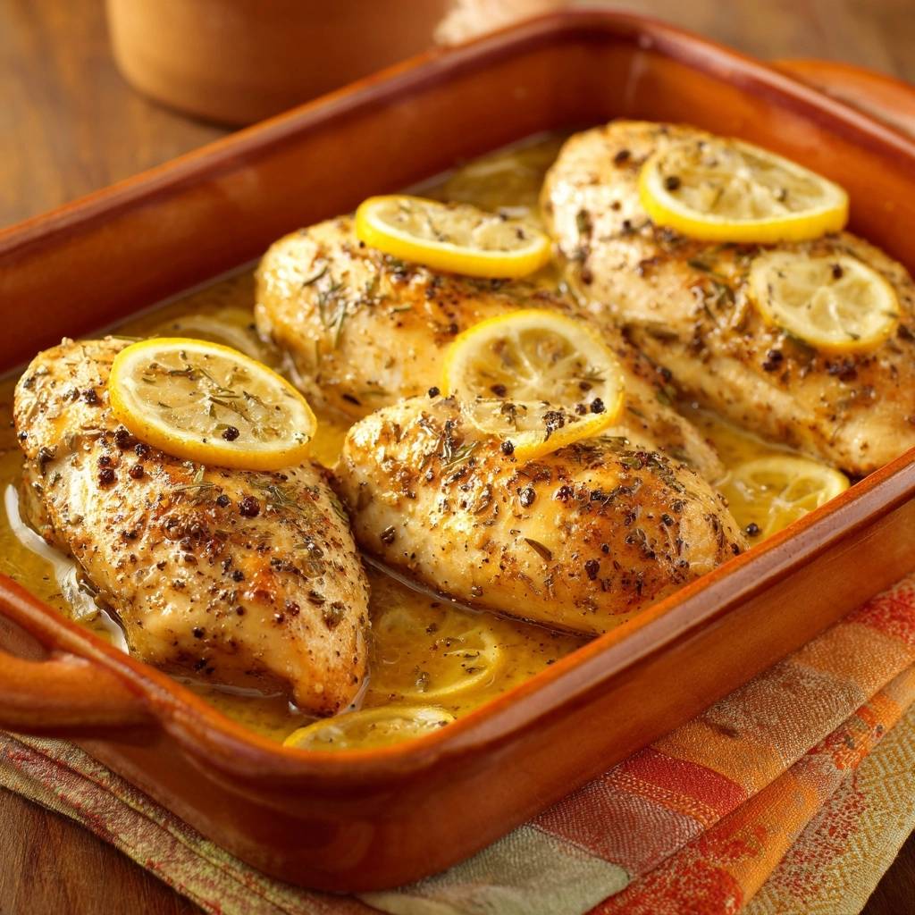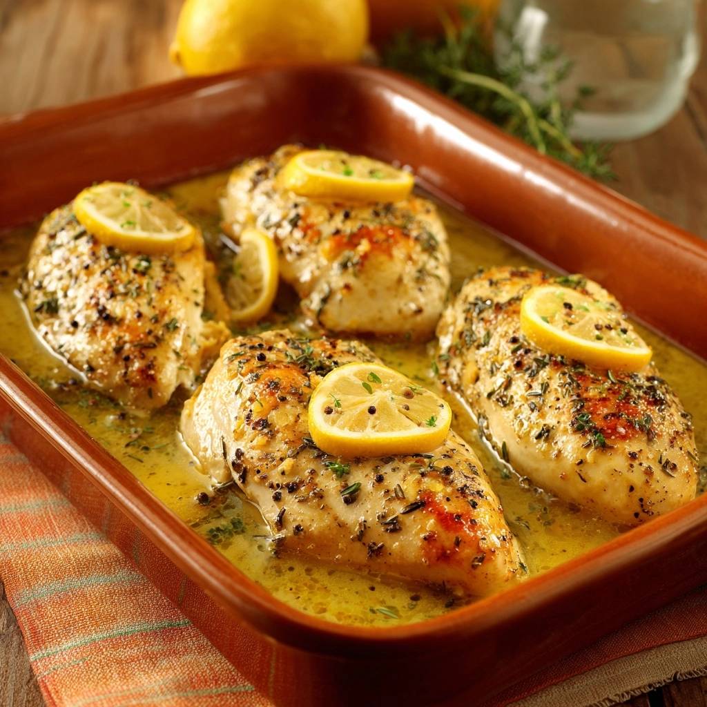 - Transfer the seared chicken to a ceramic baking dish. Pour the herb butter mixture over the chicken, ensuring the herbs coat the top of the meat as seen in the image. Top each breast with a fresh lemon slice.