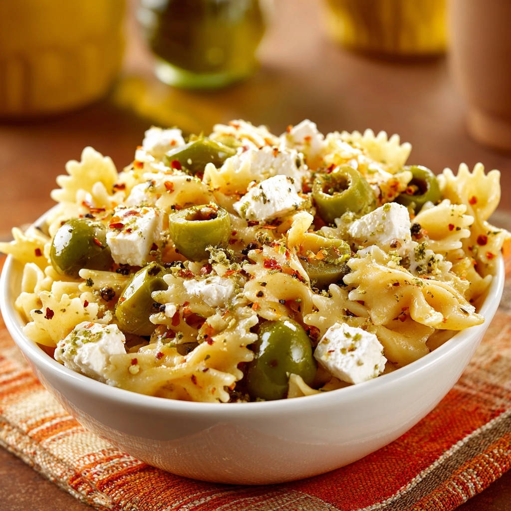 - Transfer the drained pasta to a large bowl. Add the sliced green olives and cubed feta cheese.