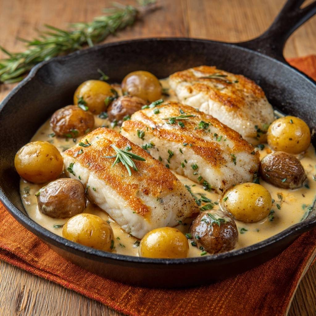 One-Pan Crispy Cod with Baby Potatoes and Rosemary Cream